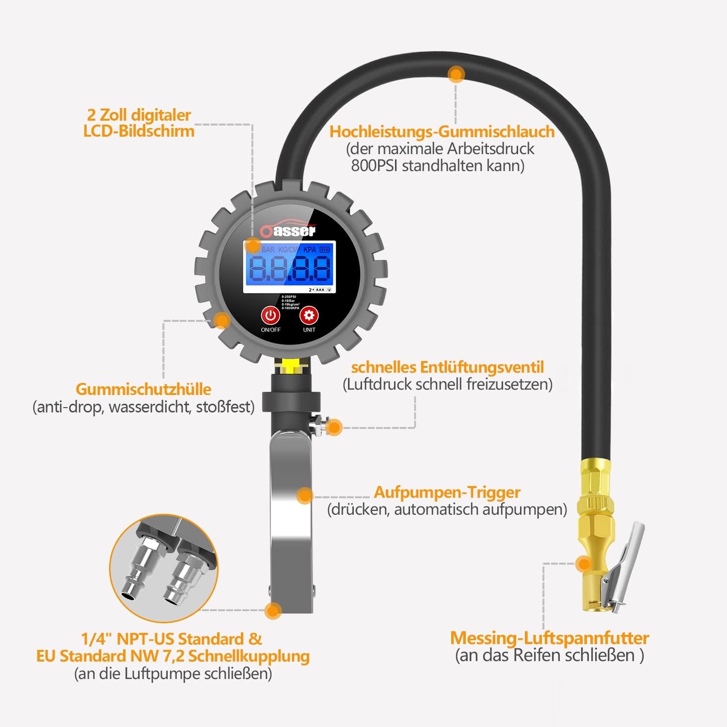 - Название элемента : измеритель цифрового давления Oasser в шинах, 18 бар, стандартный US & UE