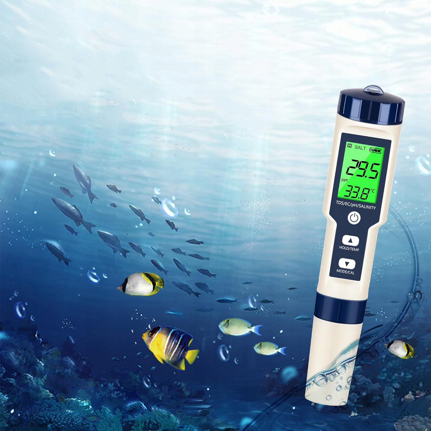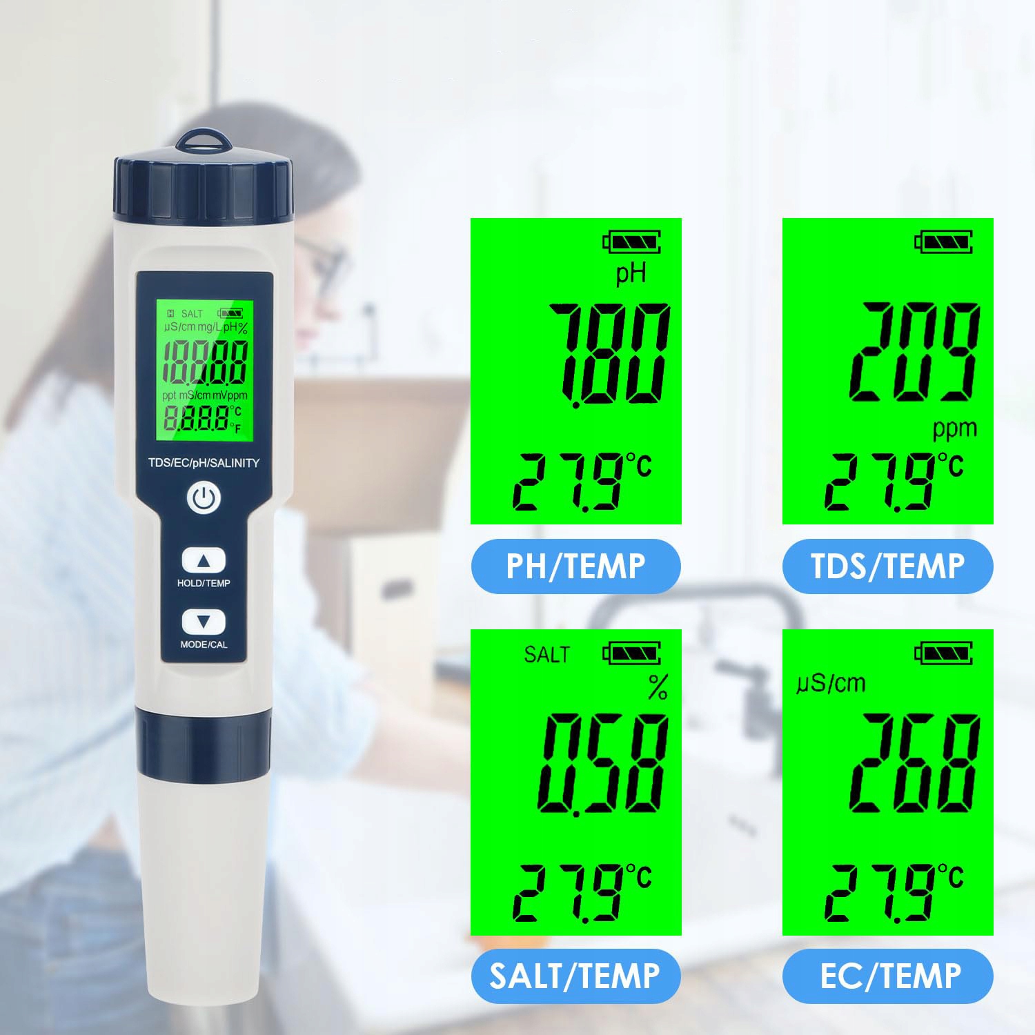 ► 【Многофункциональный 5 в 1】 - этот цифровой счетчик pH был разработан с функцией 5 в 1, который можно использовать для тестирования pH / tds / ec / ec / температура соли / температуры воды. - этот счетчик pH был разработан с прозрачной зеленой ЖК -подсветкой, которая отображает информацию в интуитивной системе. Вы все еще можете читать цифровой даже с плохой видимостью. Благодаря удобному карманному дизайну, он также удобен для ношения. 5-минутная автоматическая конструкция выключения экономит энергию и обеспечивает срок службы батареи.