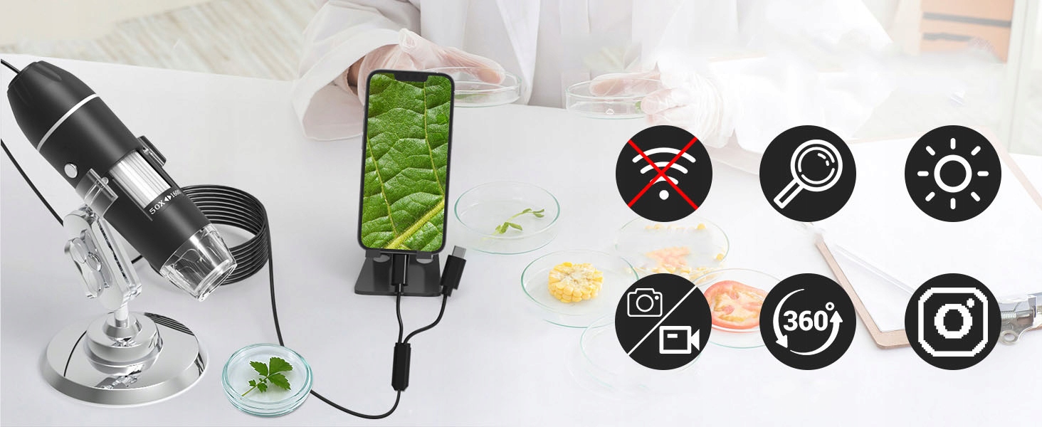 - Это портативный цифровой микроскоп высокого разрешения, который подключается непосредственно к вашему телефону. Во время использования продукт подключается напрямую к интерфейсу телефона, поддерживая мобильные устройства под управлением Android (OTG) или iOS. Его удобнее и быстрее использовать.