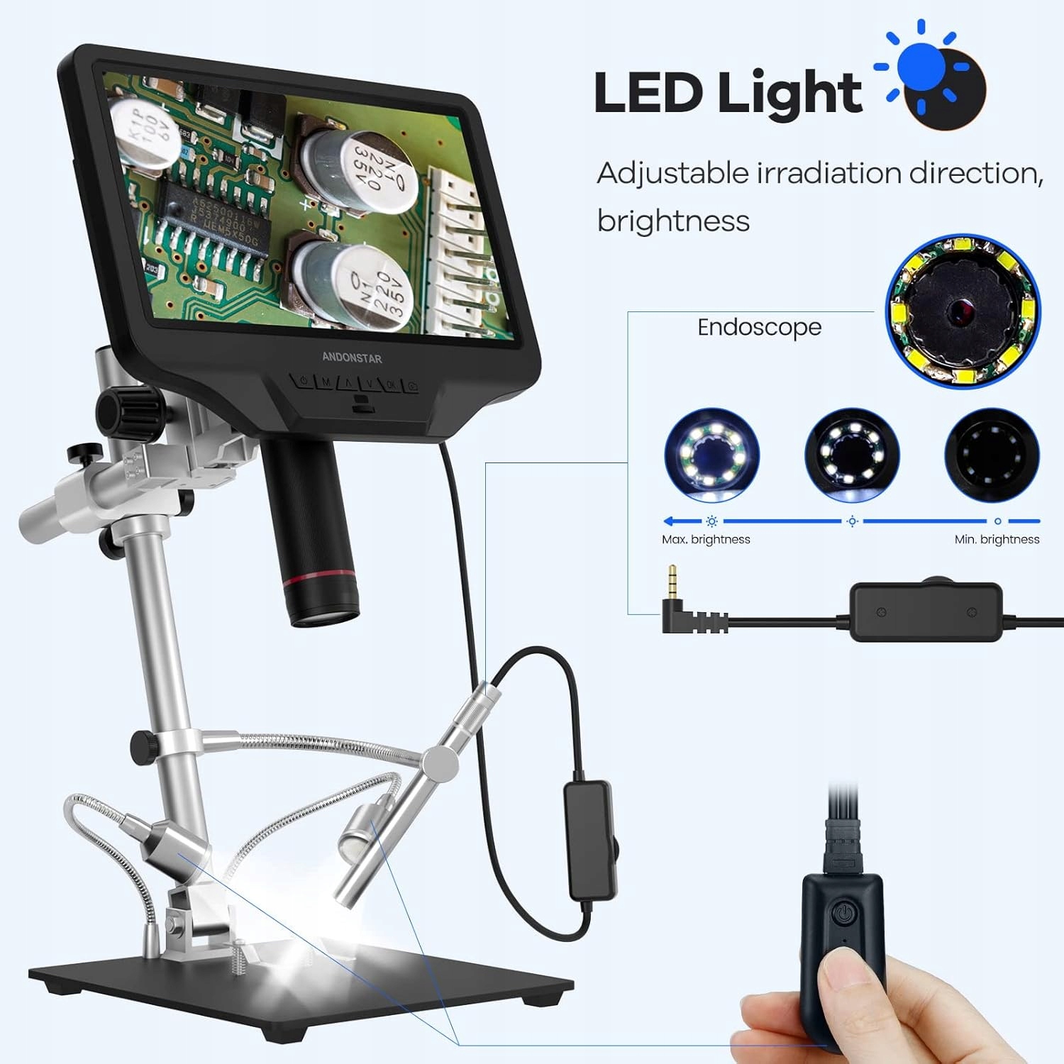 - Паятельный микроскоп с профессиональной металлической подставкой: оснащенным новейшим улучшенным кронштейном Pro Andonstar (размер: 18 x 19,8 x 33 см), угол кронштейна регулируется из переднего 360 ° горизонтально. Большая металлическая плита и более крупное рабочее расстояние могут удовлетворить ваши потребности в области ремонта больших печатных плиток. Сильный металлический материал, подходящий для высокотемпературных сред, таких как паячка.