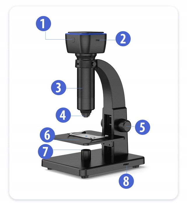 Стойка и сам микроскоп изготовлены с вниманием к деталям. Подготовка прибора к работе занимает несколько минут – микроскоп уже собран в упаковке и вам остается только включить его. В комплект входят все аксессуары, необходимые для начала работы (карта памяти в комплект не входит).
