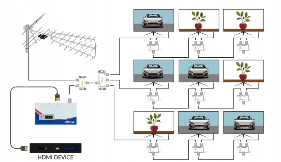 Одноканальный цифровой модулятор HDMI-DVB-T, посвященный небольшим установкам. P> • Распределение сигналов A/V в концентрическом кабеле