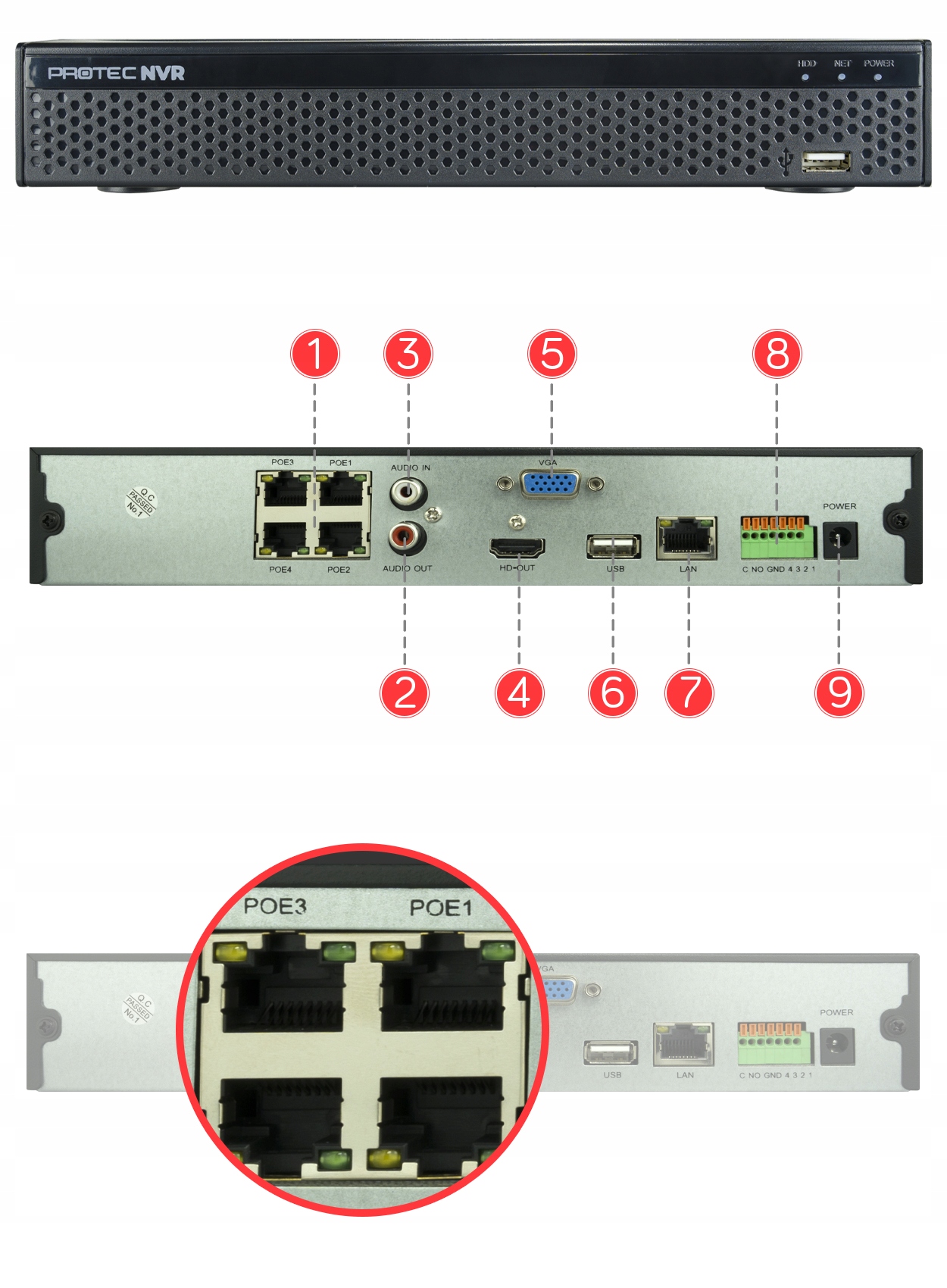 2. Блок питания PoE — камера может получать питание напрямую от регистратора по кабелю UTP