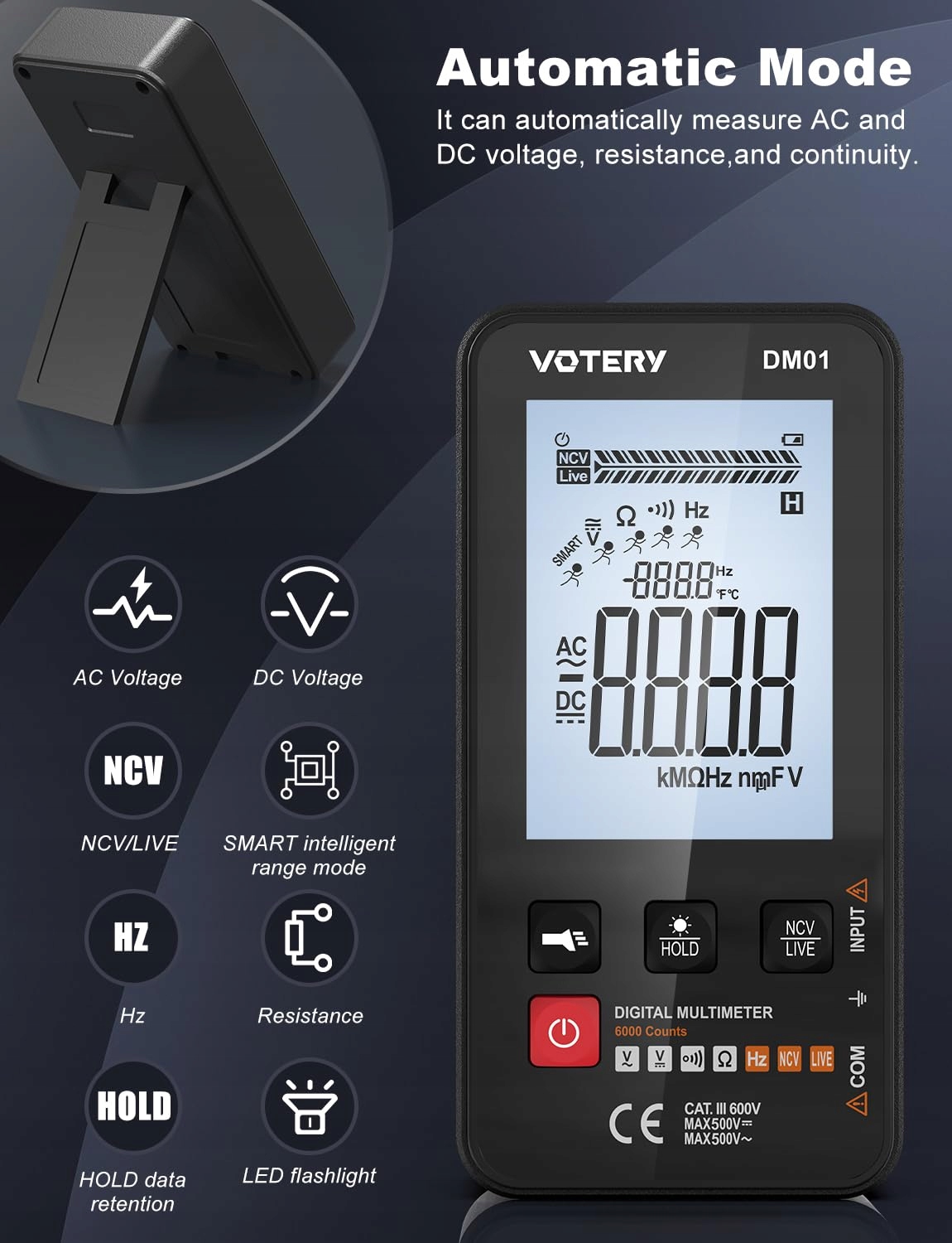DM01 - это ручный цифровой интеллектуальный мультиметр с 6000 номеров. Благодаря размеру измерения, благодаря скорости, большой двойной ЖК -экран с освещением легко читается для пользователя. Он имеет такие функции, как защита от перегрузки и низкий индикатор напряжения батареи. Независимо от того, для профессионалов, фабрик, школ, энтузиастов или дома это идеальный многофункциональный инструмент