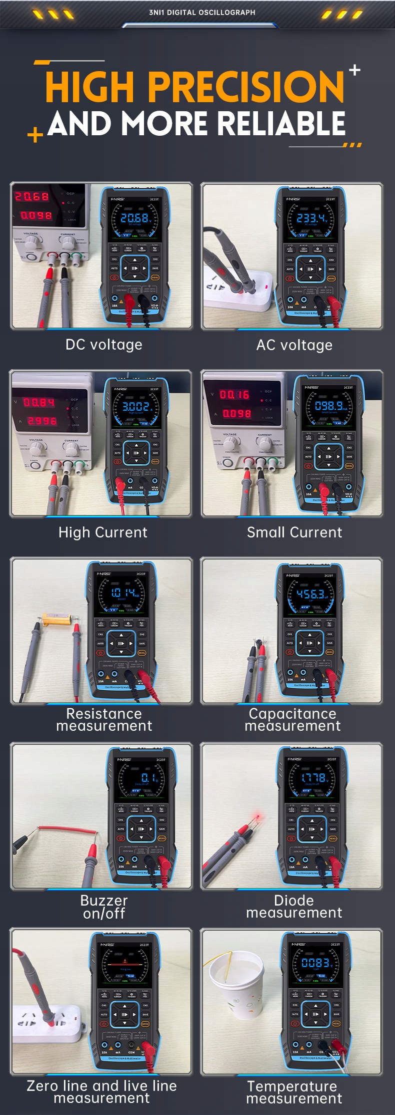 Мультиметр Fnirsi 2C23T 3-в-1 оснащен множеством функций, которые делают его чрезвычайно полезным устройством в диагностических работах, таких как: