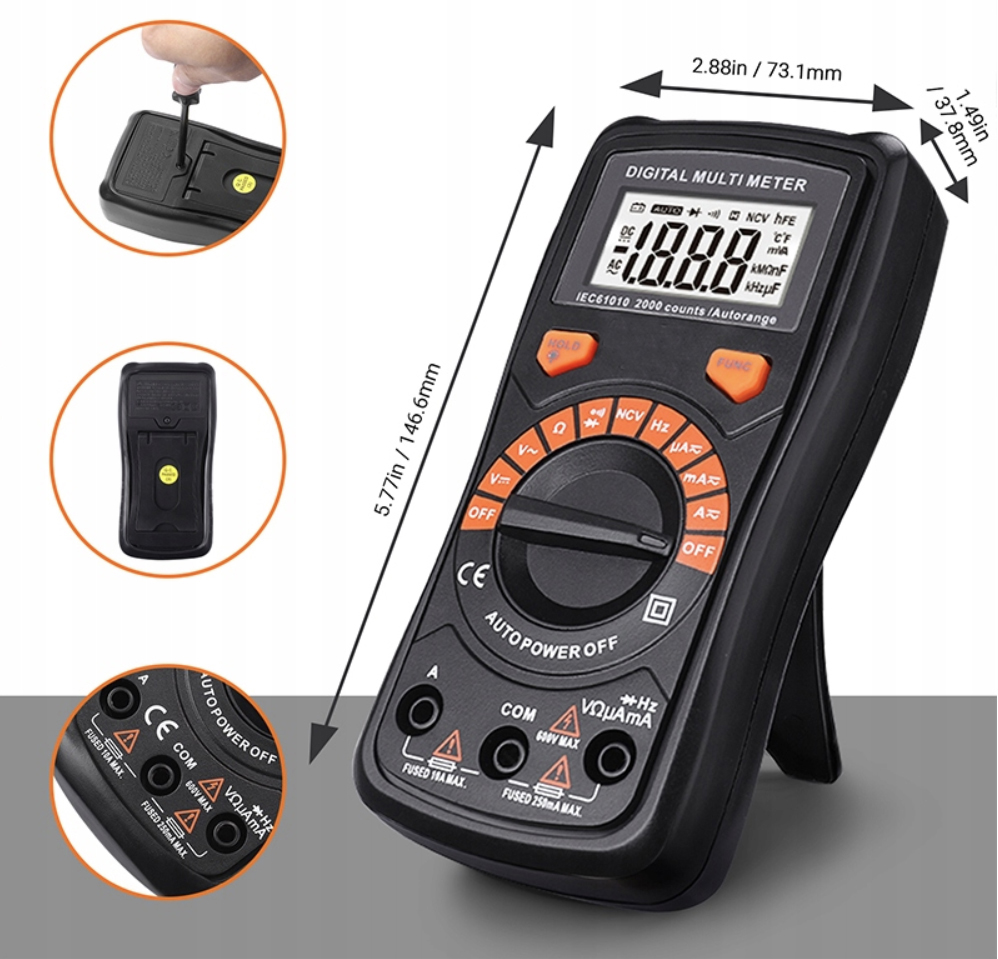 Корпус мультиметра изготовлен из нескользящего, легкого и мягкого пластика, предотвращающего падение. Подставка удерживает продукт под углом 45 градусов, чтобы облегчить чтение информации на дисплее