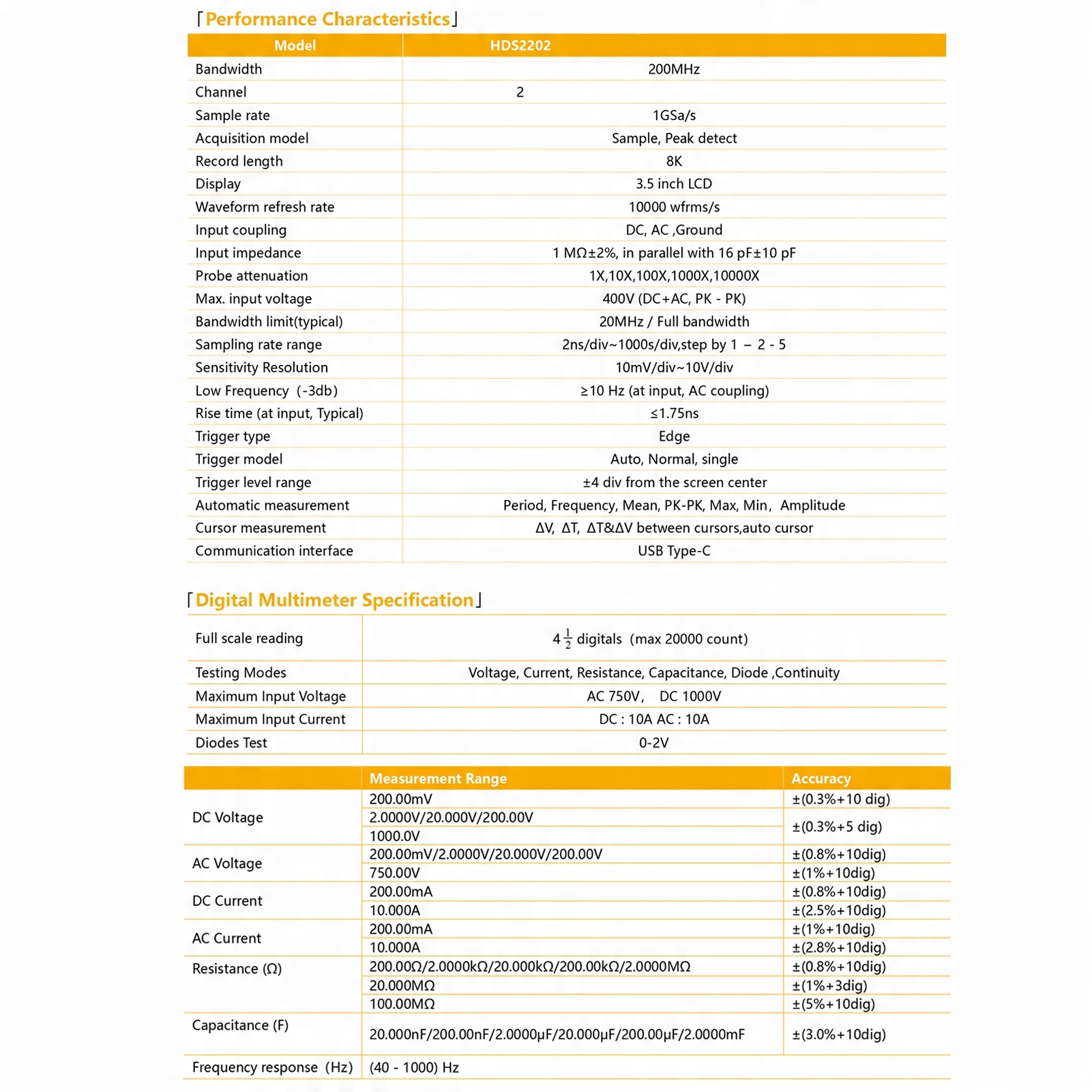 [осциллограф и мультиметр 2-в-1] Осциллограф — двухканальный вход, полоса пропускания 200 МГц, частота дискретизации 1 Гвыб/с. Мультиметр - истинное среднеквадратичное значение, 20 000 отсчетов, автоматический диапазон, тестирование напряжения/тока/сопротивления/диода/емкости/непрерывности.