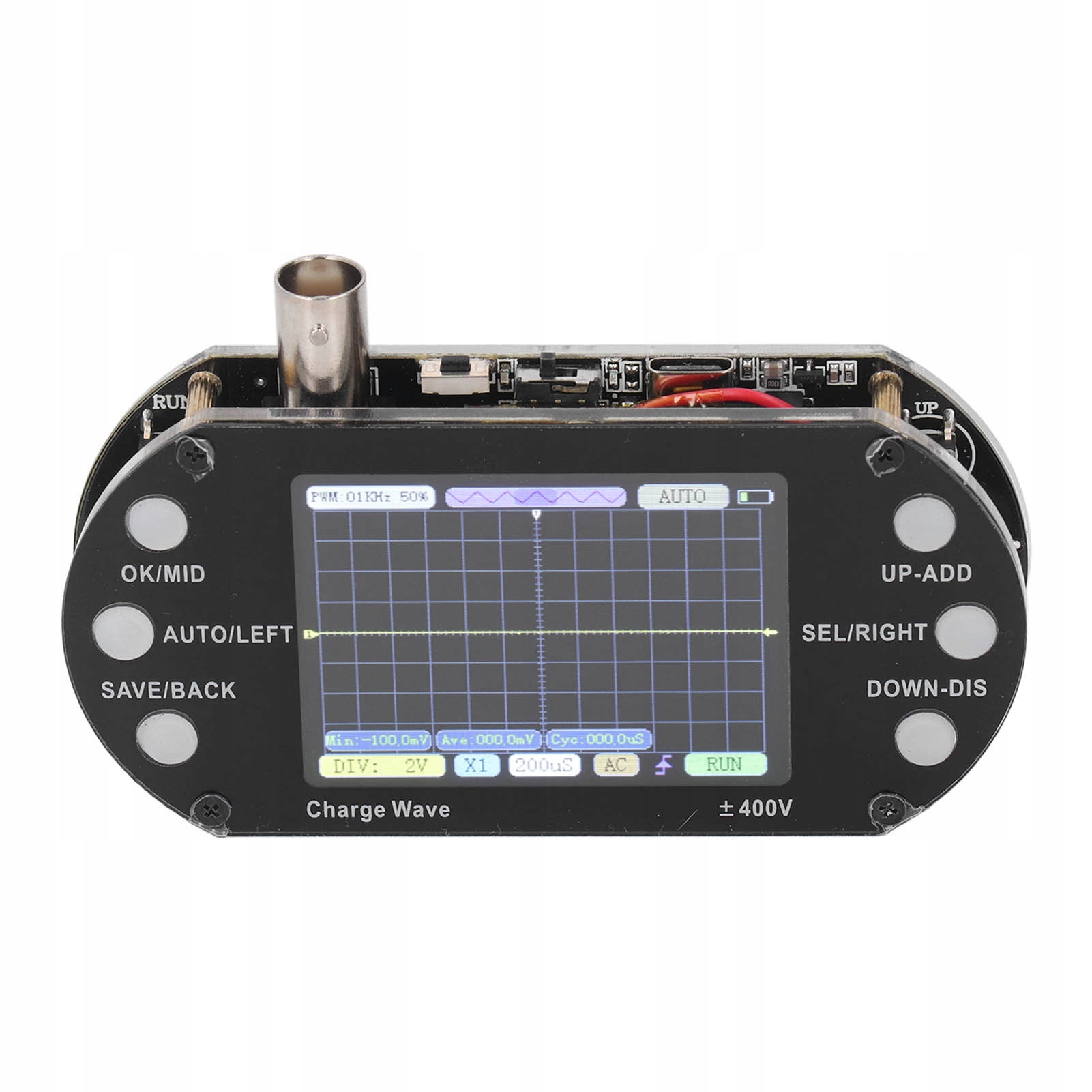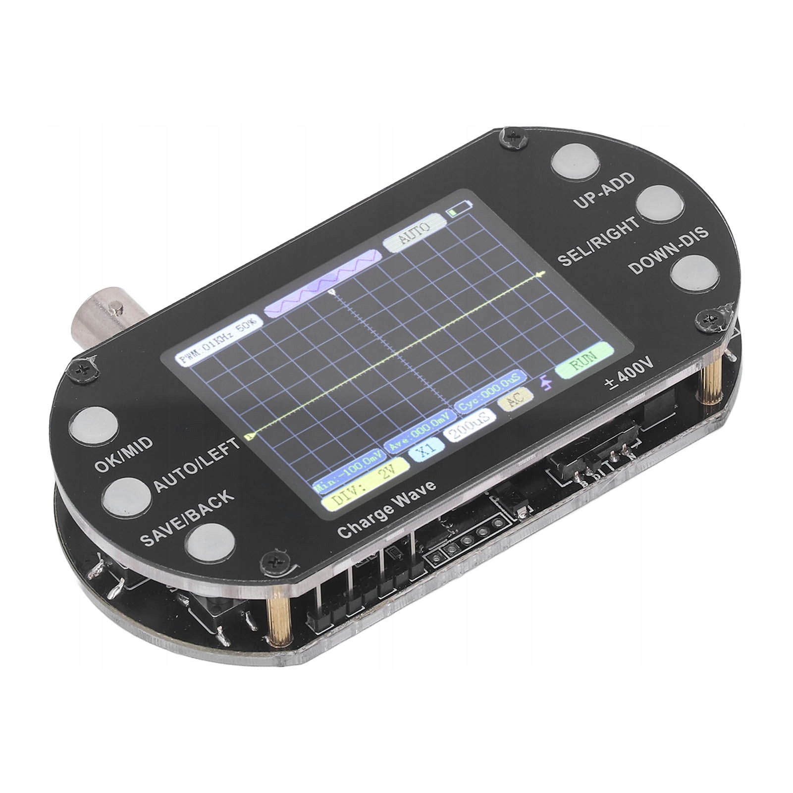 2. Четкий дисплей: позволяет тестировать синусоидальную волну, угловую волну, полуволну и т. д. Осциллограф также оснащен 2,4-дюймовым TFT-дисплеем с разрешением 320 x 240.