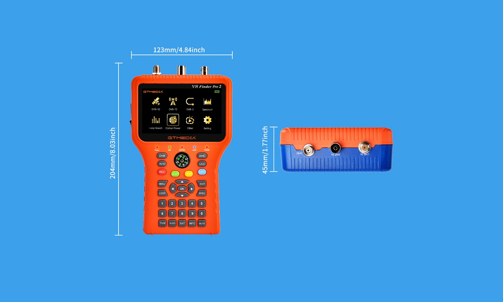 gtmedia v8 finder pro-это ручный комбо-измеритель в соответствии с DVB-S2X/S2/S/T2/T2/T/C/ATSC-C и MPEG-2/4 H.264/H.265 (10 бит). Благодаря компактному размеру, легкому дизайну, интуитивному пользовательскому интерфейсу, долгом сроке батареи и богатому набору функций, измеритель детектора сигнала обеспечивает все функции, необходимые для установки и проверки цифровых телевизионных услуг, сигнала антенны и кабельного сигнала в жилых домах или многочисленных зданиях