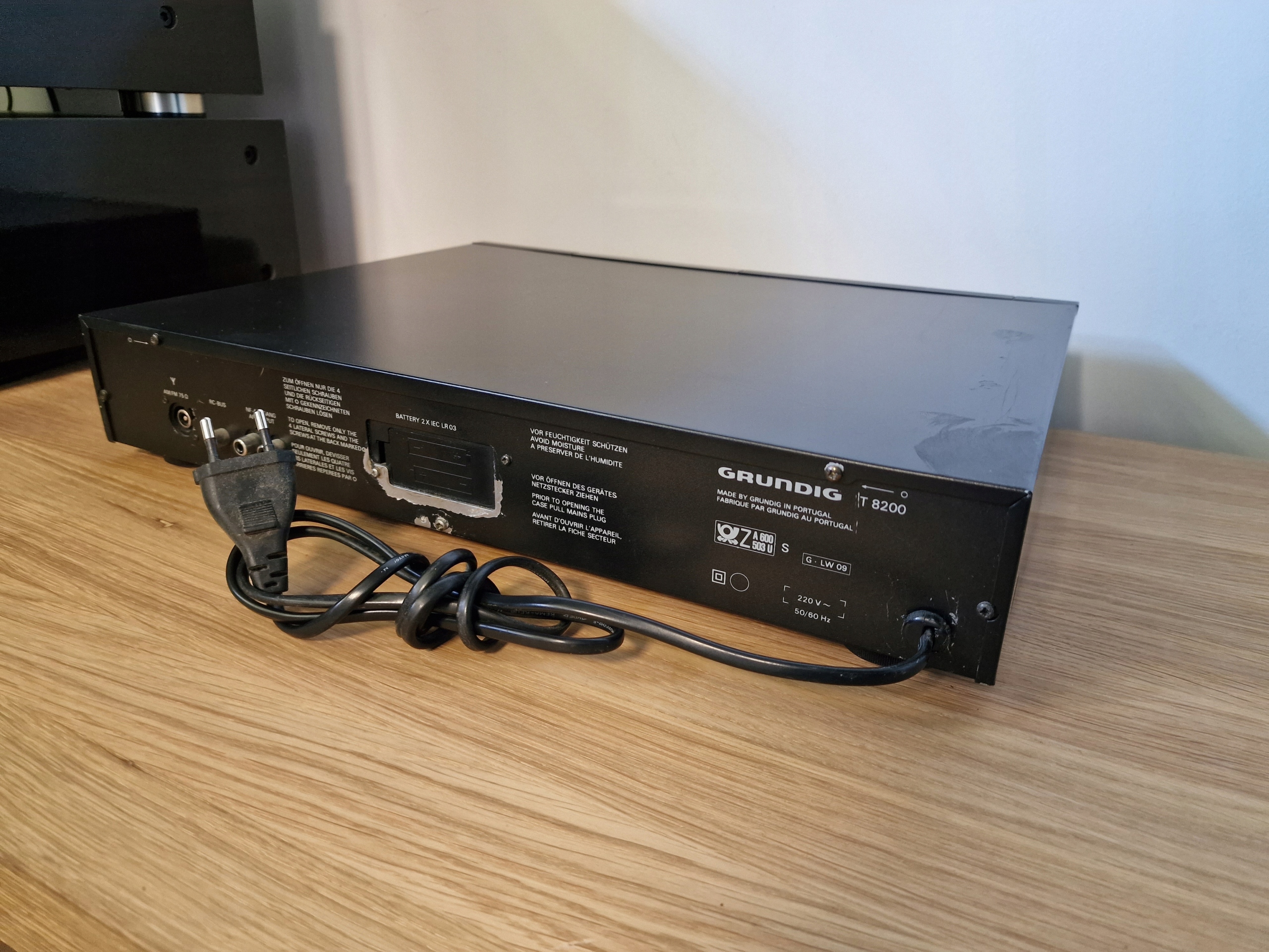 Производитель: Grundig Модель: T8200 Годы постройки: 1987 - 1989 Сделано в: Португалия Черный цвет Размеры: 435 x 75 x 340 мм (ШxВxГ) Вес: 4,4 кг Новая цена примерно: 500 DM Подключения Количество входов : Разъем FM-антенны: коаксиальное гнездо домашней антенны 75 Ом Разъем антенны СВ: 300 Ом Количество выходов: Линейный выход: подключение к разъему «тюльпан» усилителя Технические характеристики Прием: УКВ, СВ, ДВ Частоты: FM: 87,5 МГц - 108 МГц СВ: 522–1611 кГц (можно преобразовать в 520–1620 кГц для США, у специализированного дилера) LW: 153–281 кГц (может быть преобразовано в 153–351 кГц для США, у специализированного дилера) Частотная характеристика: 10–15 000 Гц < =3 дБ Входная чувствительность: VHF моно <= 1 мкВ для отношения S/R 26 дБ FM-стерео <= 35 мкВ для отношения S/R 46 дБ Коэффициент искажений: Моно <= 0,2% Стерео <= 0,4% Отношение сигнал/шум FM: Моно >= 67 дБ при 75 дБ Стерео >= 64 дБ при 70 дБ Перекрестные помехи FM: >= 40 дБ при 1 кГц Селективность: Моно >= 70 дБ Стерео >= 65 дБ Порог переключения стерео: <25/<18 мкВ при 98 МГц при 75 Ом Порог отключения звука: вкл./выкл. <18/<25 мкВ при 98 МГц при 75 Ом Разъем RC-шины Память станции: 19 (1–9 и 0/10+)
