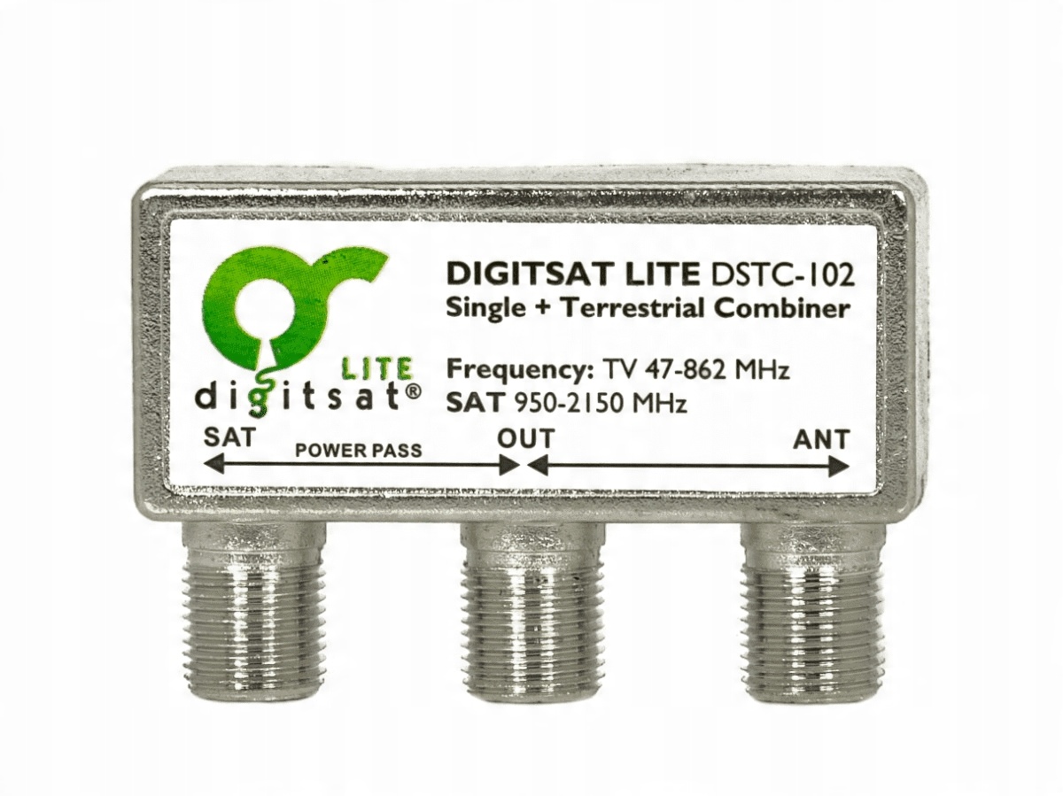 Комбайнер Digitsat DSTC-102, позволяющий суммировать сигнал спутникового конвертера с сигналом антенн наземного телевидения DVB-T.