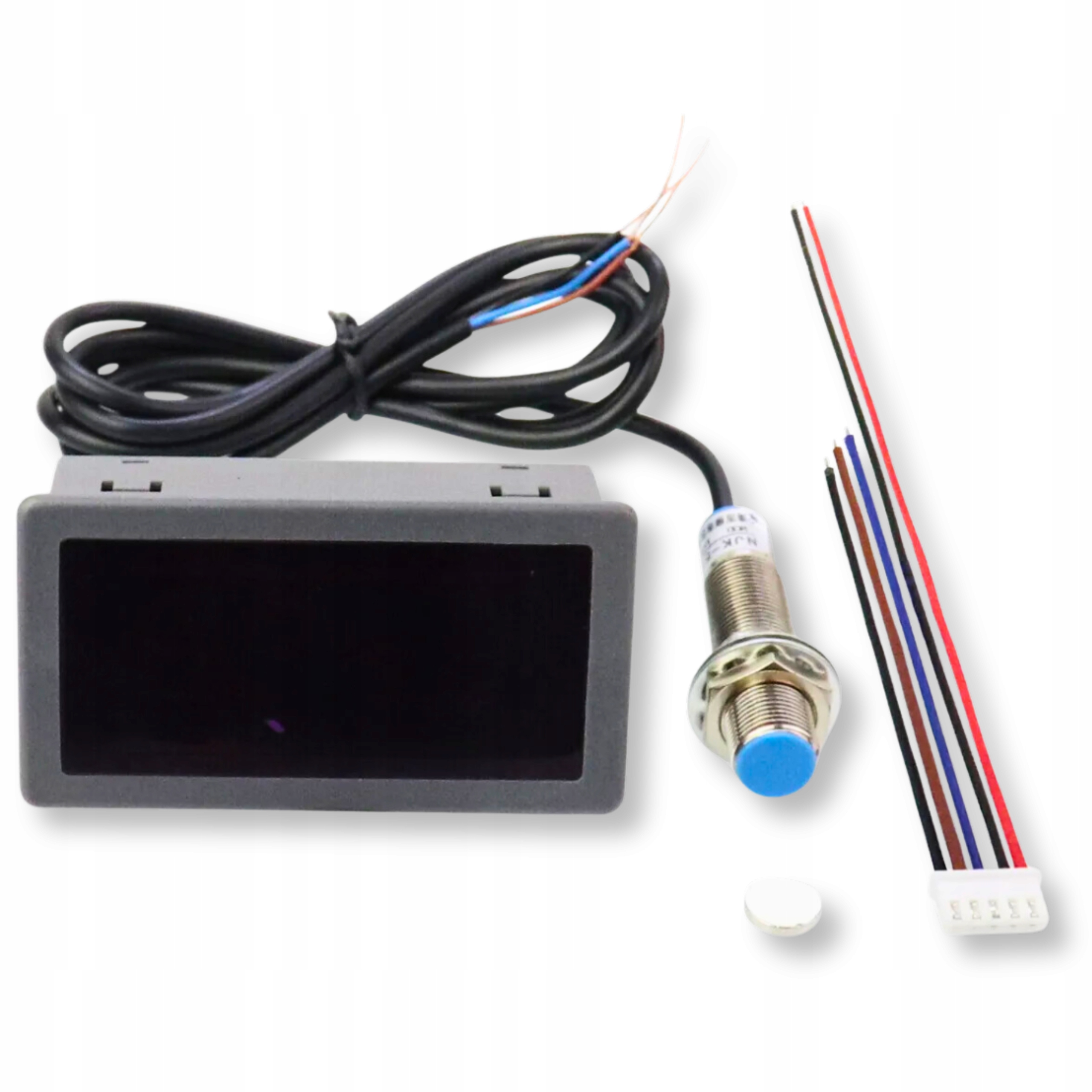 Для измерения скорости вращения используется цифровой тахометр, а результат отображается на красном LED дисплее с размерами 67 x 32 мм, в об/мин единицы (оборотов в минуту). В устройстве используется датчик Холла NPN, работающий с магнитом, установленным на вращающемся элементе. Он идеально подходит для измерения скорости валов, вентиляторов и других вращающихся элементов. Счетчик оснащен датчиком NJK-5002C, магнитным цилиндром диаметром 12 мм и диапазоном измерения 10 мм. Работает при температуре от 0 до 50°С, питается от сети постоянного тока 8-24В с потреблением 40мА. Диапазон измерения составляет от 10 до 9999 об/мин, точность измерения 0,1%.