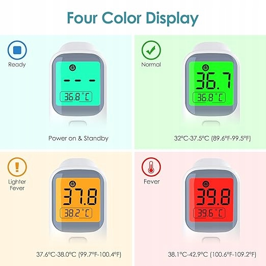 - 【4 Цвета подсветки】 на поверхности не -контактной поверхности к ушам всегда остаются синим. В режиме тела: зеленый: от 89,6 до 99,5 ℉ (от 32,0 до 37,5 ℃); оранжевый: с 99,7 до 100,4 ℉ (от 37,6 до 38 ℃); Красный: от 100,6 до 109,2 ℉ (от 38,1 до 42,9 ℃)