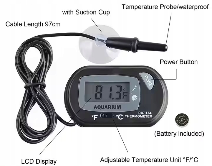 Цифровой термометр с датчиком представляет собой точное устройство, предназначенное для точного измерения температуры в диапазоне от -50 ° C до +70 ° C, с точностью ± 1 ° C благодаря универсальному применению, он будет работать как в аквариумах, так и при температуре мониторинга в холодильниках, морозильниках, дома или на открытом воздухе.