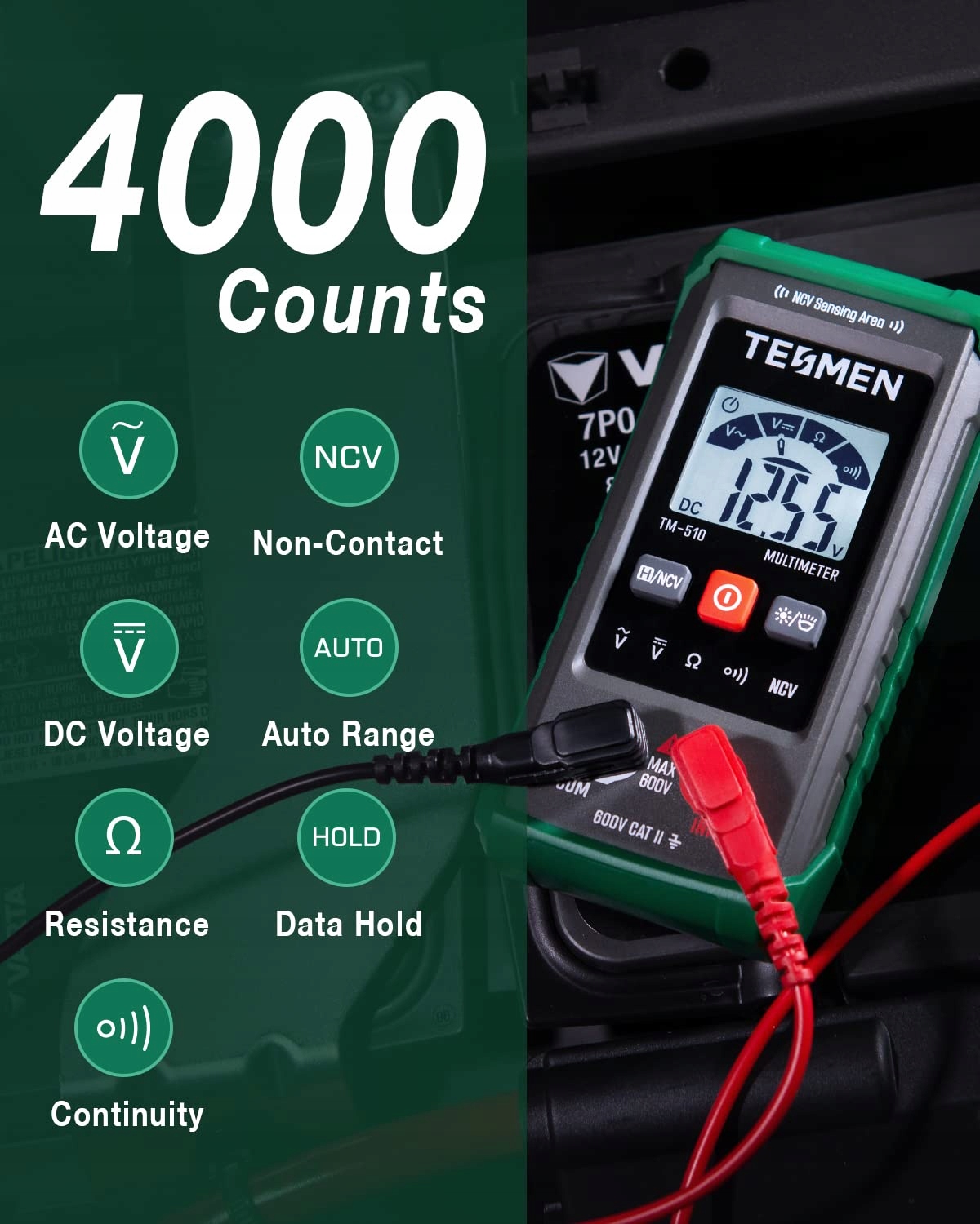 TESMEN TM-510 Цифровой мультиметр, 4000 отсчетов, интеллектуальное измерение, автоматический тестер напряжения, вольтметр с функцией бесконтактного измерения напряжения, измерение напряжения переменного/постоянного тока, сопротивление, целостность, зеленый