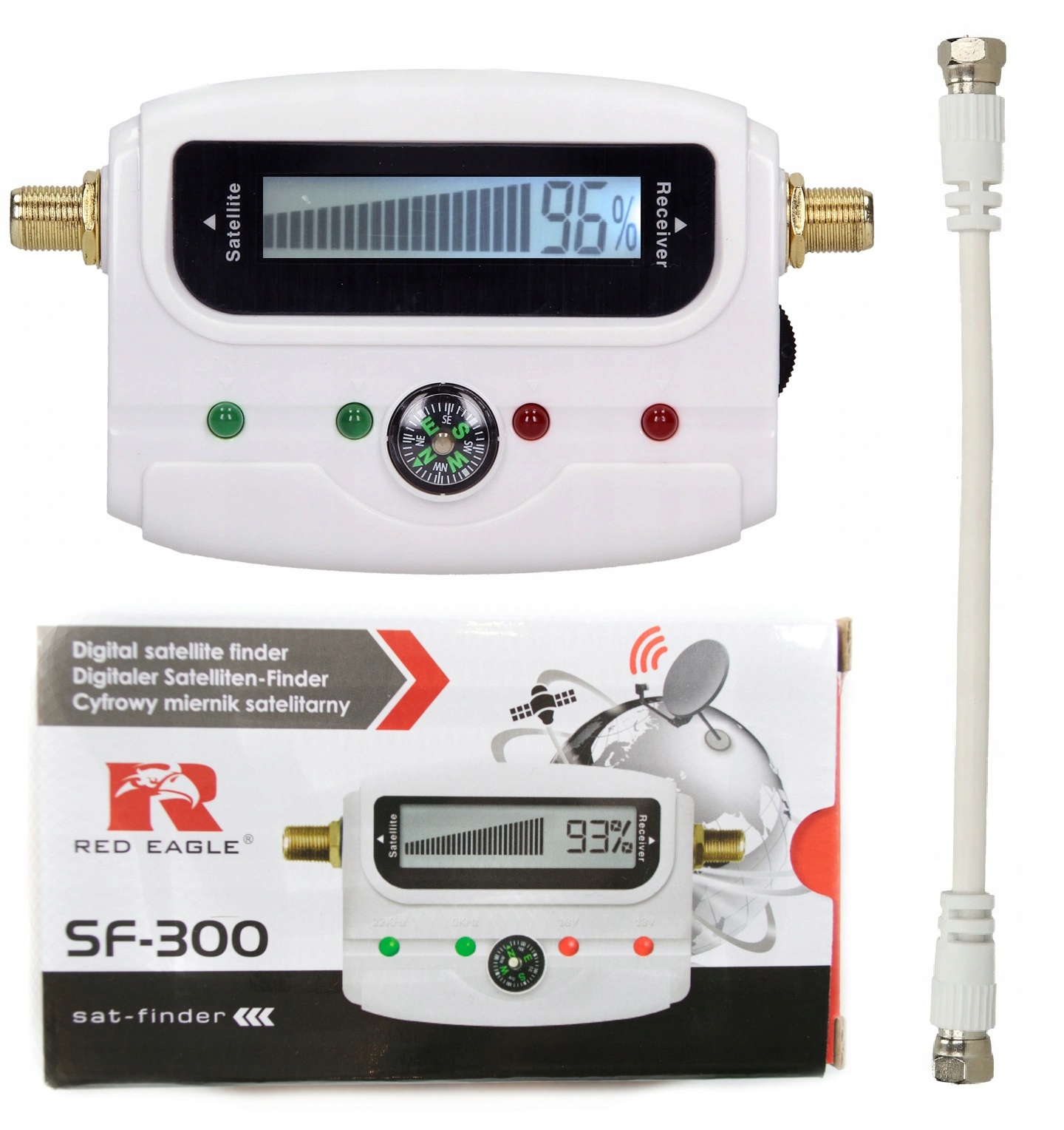 Измерение, выраженное в процентах, позволяет заметить даже малейшие различия в положении антенны, а благодаря доступной звуковой сигнализации, мы можем установить его, даже не глядя на дисплей. Благодаря встроенному в корпус компасу мы можем быстро определить направление, в котором следует направить антенну.
