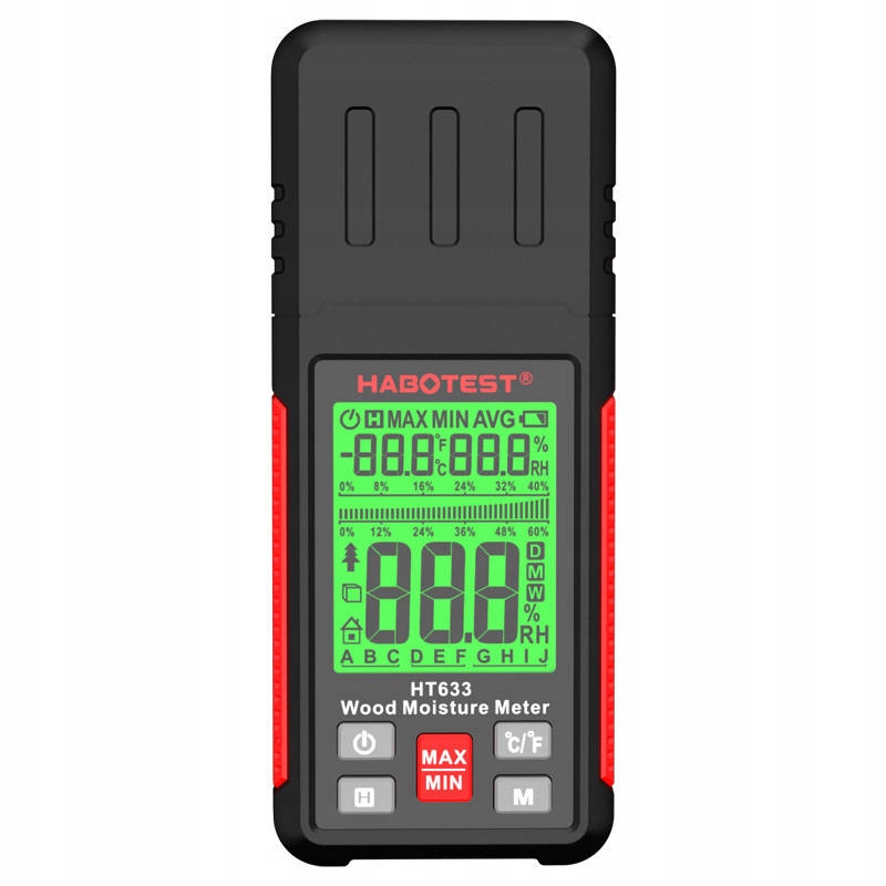 Прибор имеет 2 наконечника, которые обеспечивают быстрое и точное измерение — его можно использовать для таких материалов, как дерево, бетон, штукатурка или кирпич. С помощью Habotest HT633 вы также можете измерять влажность и температуру окружающей среды. ЖК-дисплей обеспечивает удобный доступ к информации практически в любых условиях, а низкий, средний или высокий уровень влажности обозначается зеленым, оранжевым или красным цветом соответственно.