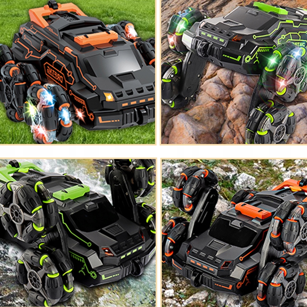 Двухфункциональный пульт дистанционного управления: в одном режиме вы надеваете часы на руку и управляете трюковой машиной, меняя жесты рук, в другом режиме вы используете пульт дистанционного управления, чтобы позволить езди на машине как хочешь. Шесть гигантских противоскользящих колес, соединенных ударопрочными пружинами, невероятно устойчивы, идеально подходят для специализированных операций, таких как повороты, заносы и перевороты, и созданы для превосходной управляемости и контроля. Доставляет детям и родителям невероятное удовольствие от радиоуправления.