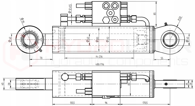 ЦИЛИНДР ВРАЩЕНИЯ ПЛУГА ЦИЛИНДР 2-СТР. 80/40/236 ХОД 236 мм L:480 ГИДРОЛИДЕР