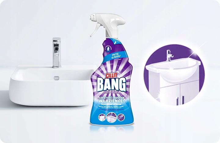 CILLIT BANG CLEAN AND SHINE IN THE BATHROOM. Наш чрезвычайно эффективный продукт идеален для удаления грязи в ванной комнате без лишних усилий.