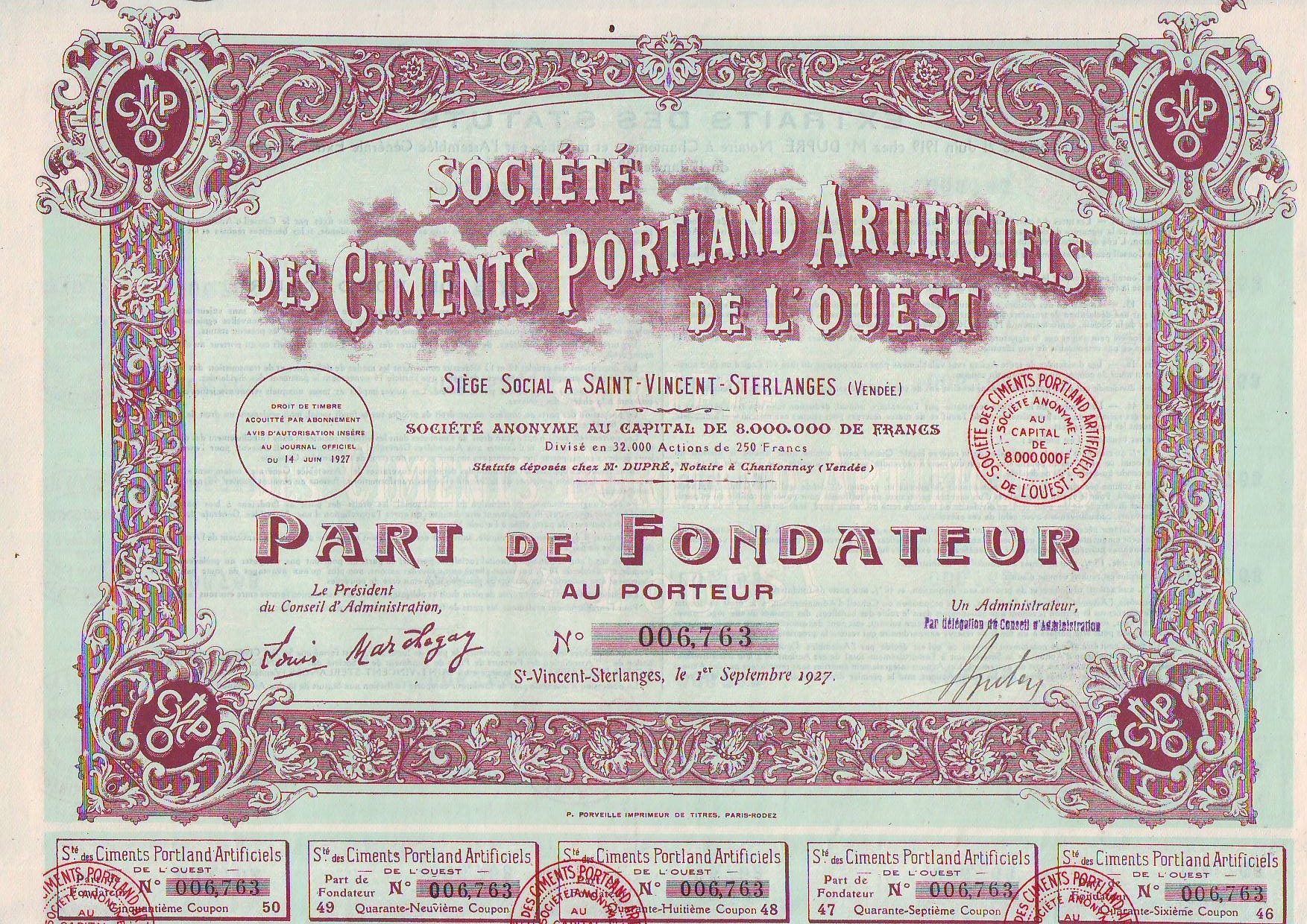 Ciments Portland de l`Ouest, дія 1927 року.