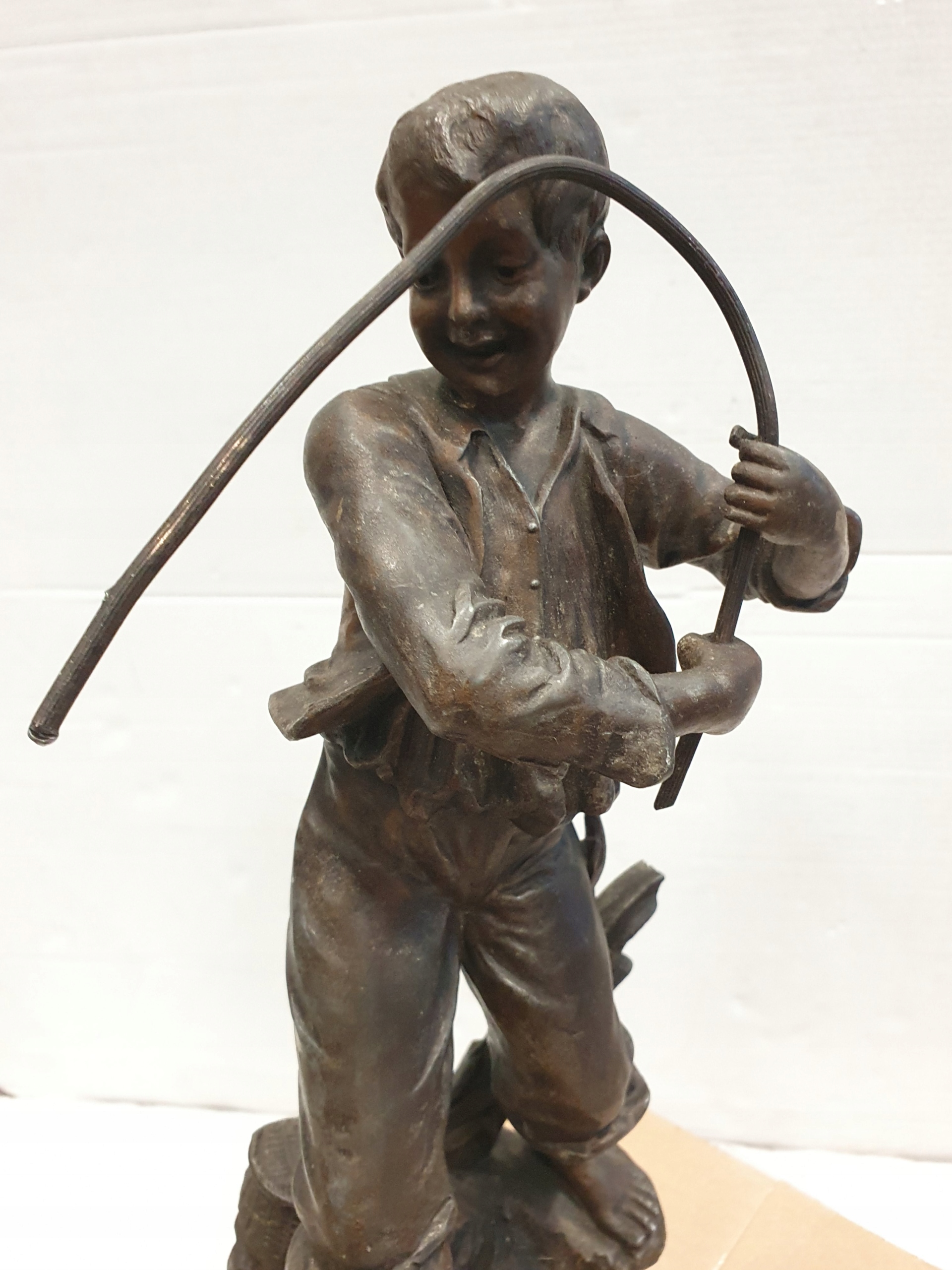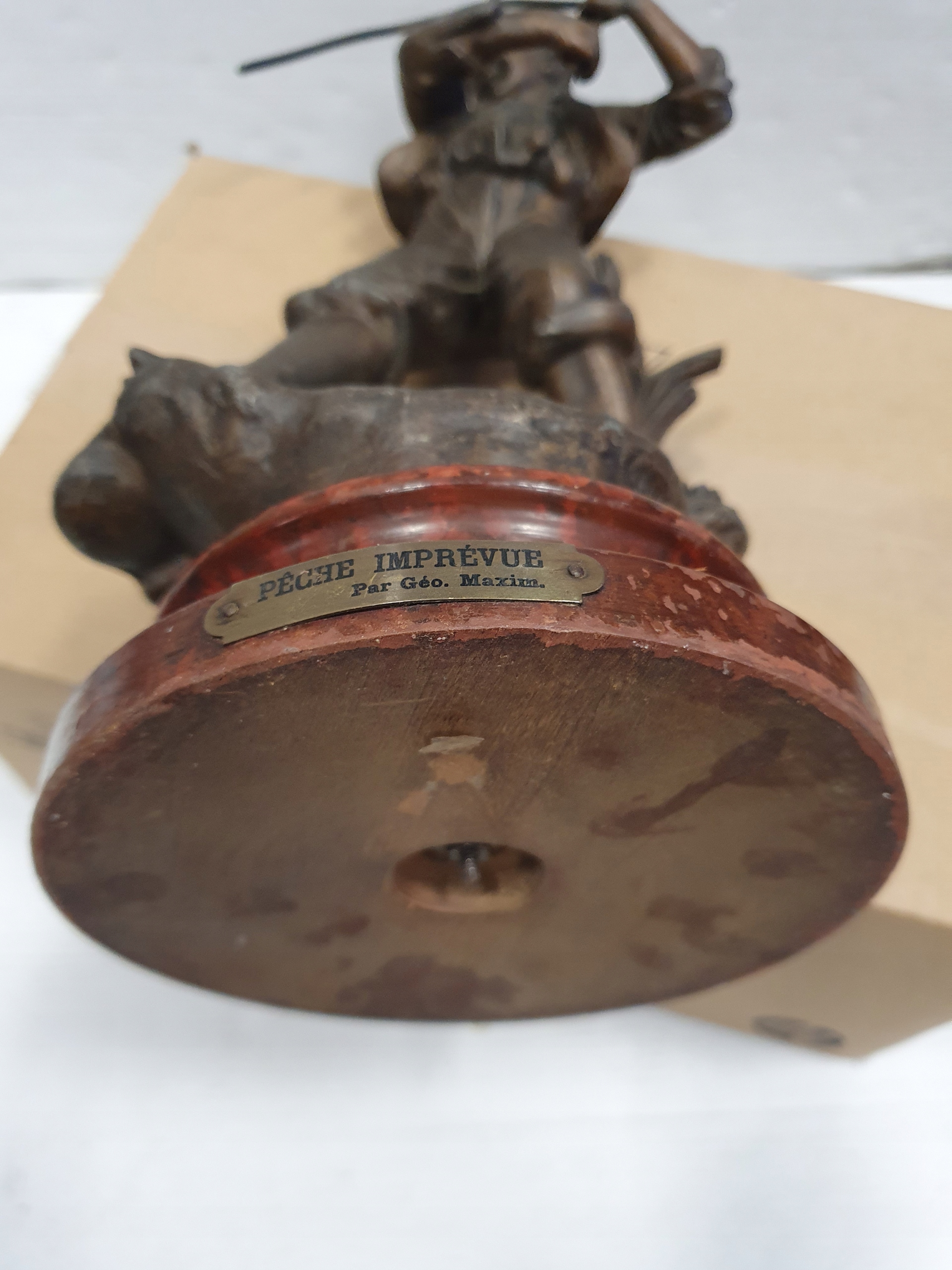 Цинковая фигурка на деревянной основе с подписью.