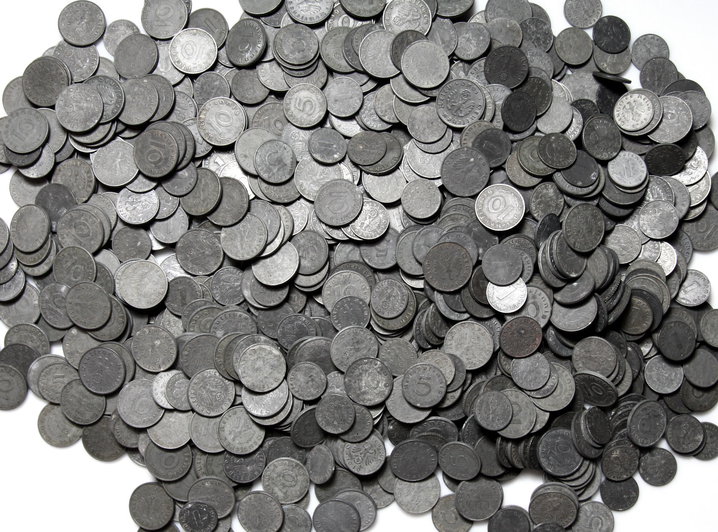 Набор из 100 монет как на картинке - это немецкие монеты номиналом 1, 5 и 10 рейхспфеннигов - все типа, выпущенного в период 1940 - 1945 годов (цинк). Все со свастиками! Там нет ни одной другой монеты! Все монеты в хорошем состоянии - ЭТО НЕ РАСПЫЛКИ! Состояние чердака и ящиков хорошее, без коррозионных ям и повреждений.