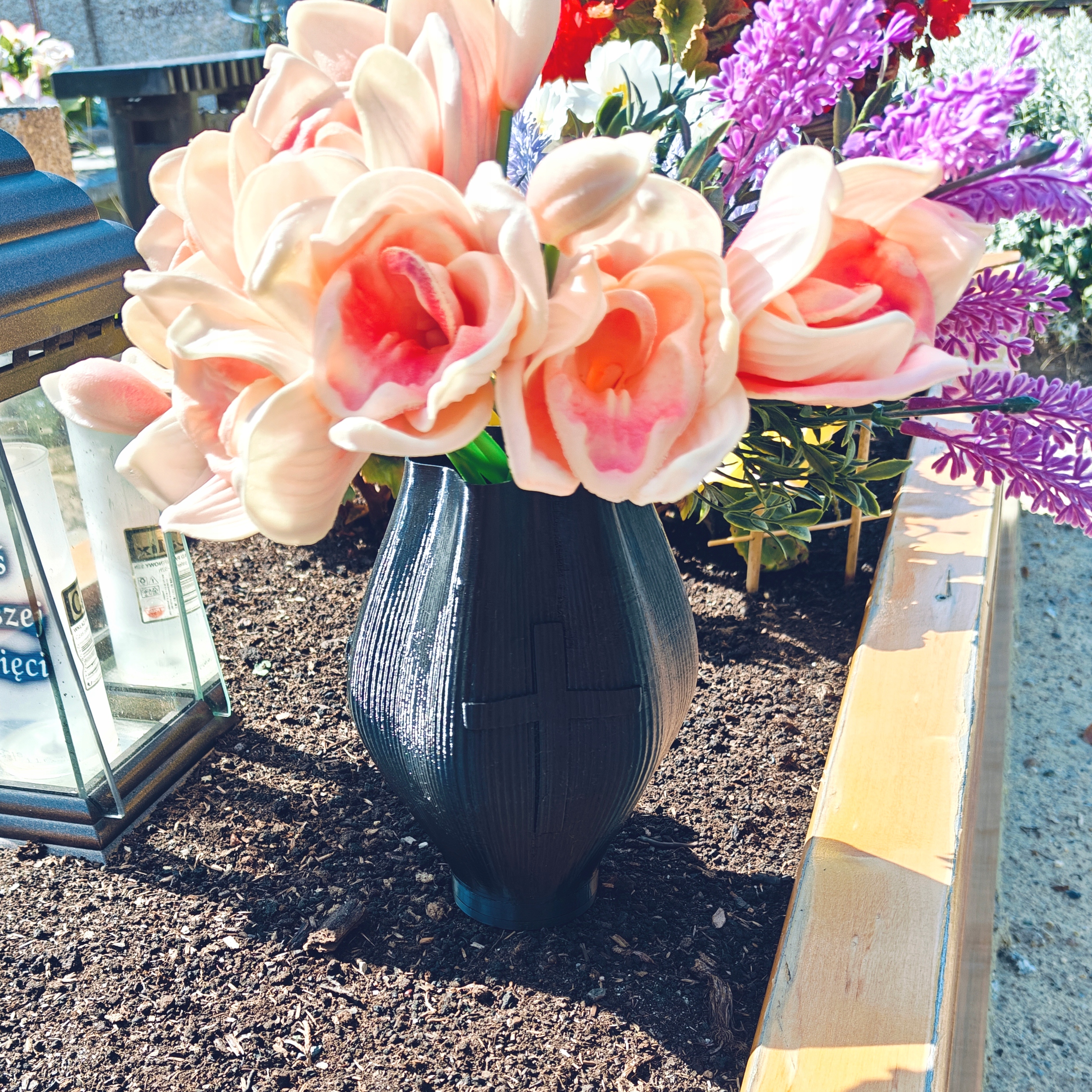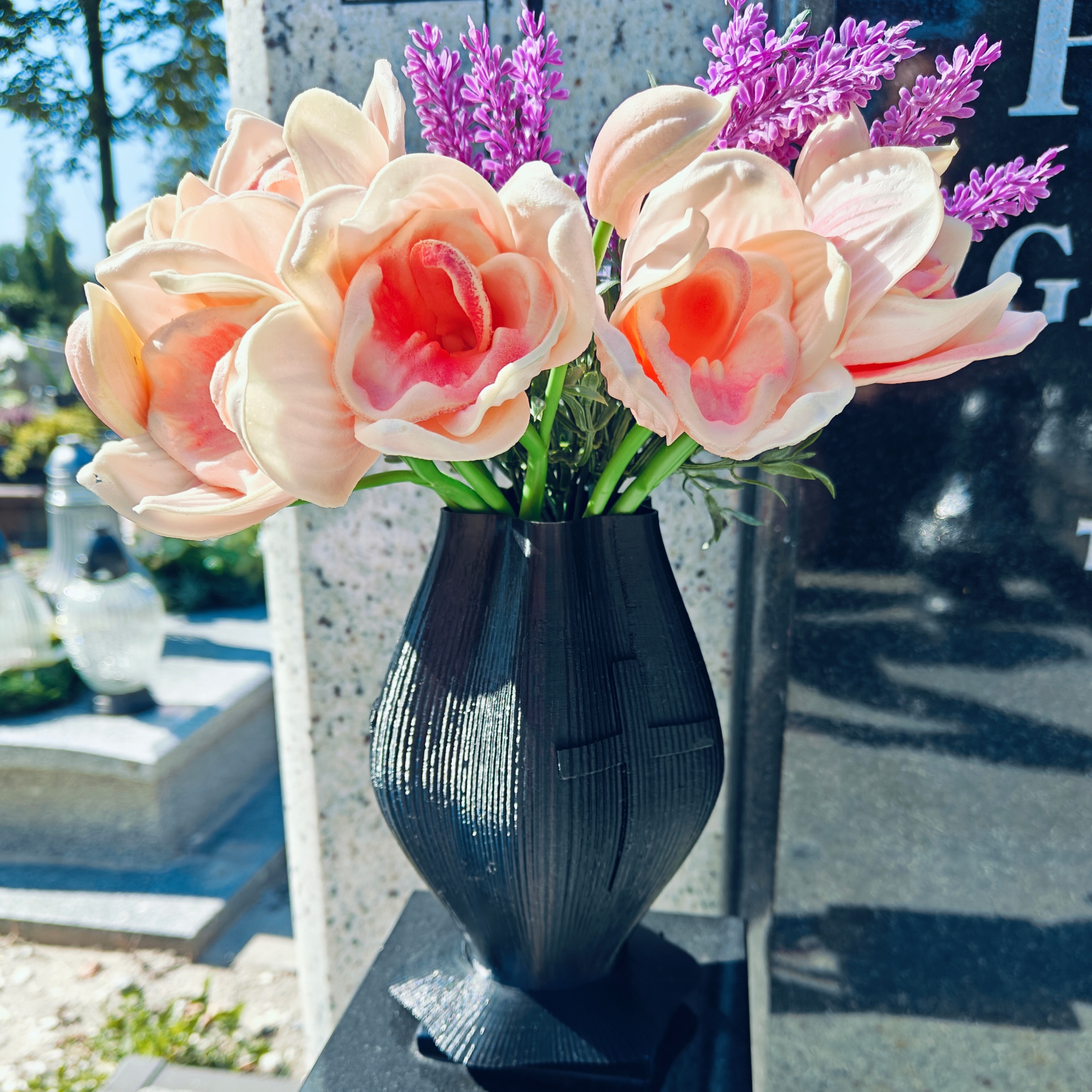 Разработанный с вниманием к деталям, в классическом черном цвете, он идеально сочетается с различными искусственными или живыми цветами, придавая им неповторимый шарм на каждой могиле.