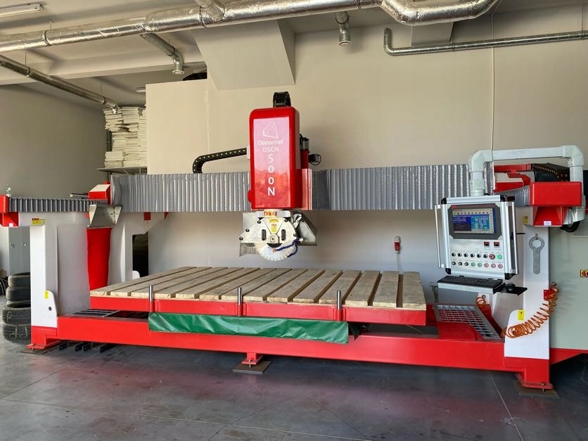 Моноблочная пила с ЧПУ DSCN 500N представляет собой трехосный станок для резки камня с возможностью резки кривых, сверления и обработки отверстий с помощью фрезы крепятся непосредственно на шпиндель. Три оси соединены серводвигателем итальянской компании ESA.