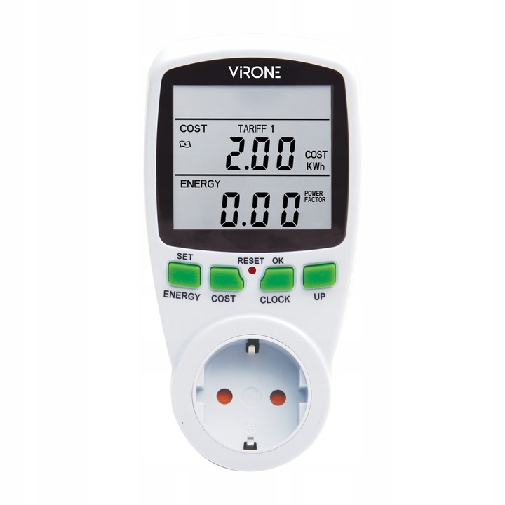 Ваттметр ViRONE EM-1 позволяет проверить потребление электроэнергии и рассчитать стоимость энергии, потребляемой подключенным устройством (2 отдельных тарифа). Может использоваться только с электрические розетки стандартного напряжения 230 В переменного тока.Максимальная нагрузка на розетку не может превышать3680 Вт. Внутренняя батареясохраняет настройки устройства в случае отключения электроэнергии.