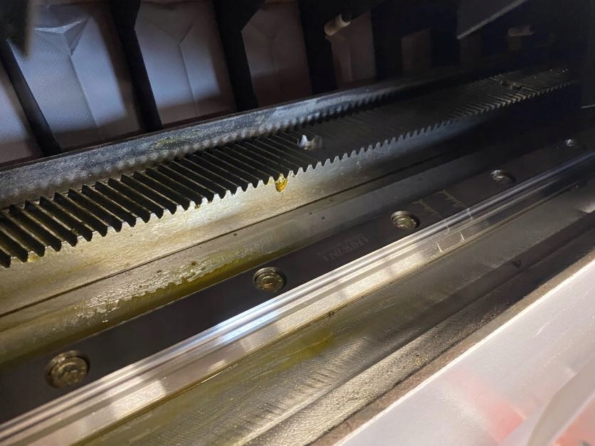 - Ось Y – Перемещение моста по горизонтальным направляющим, привод через винтовую рейку; подшипники на линейных каретках