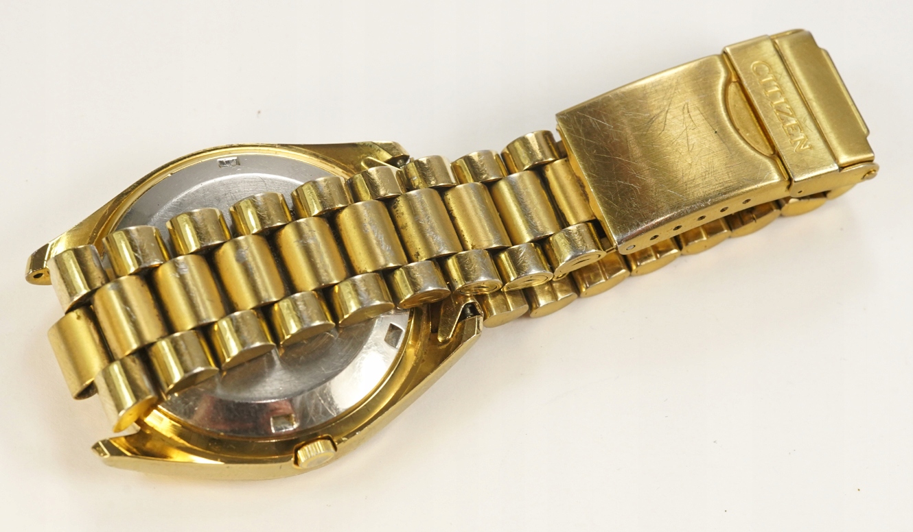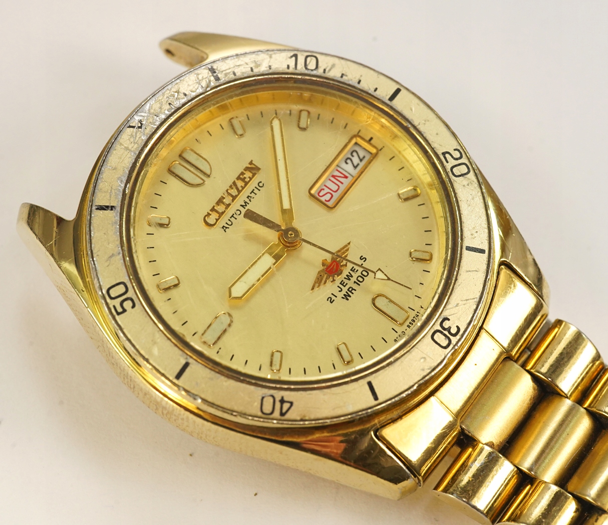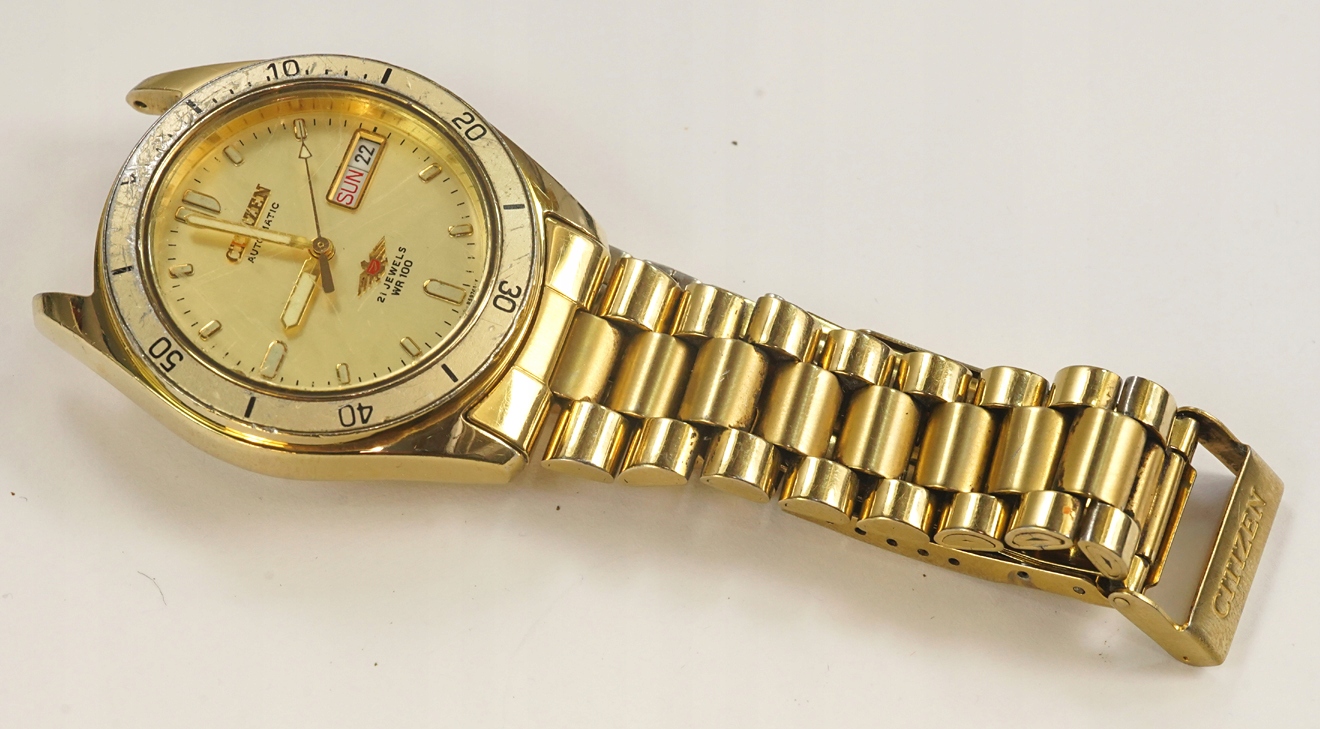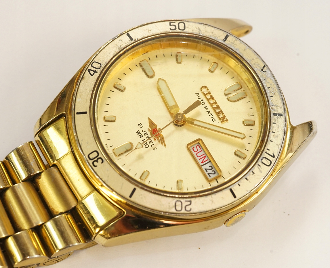 Оригинальные интересные мужские наручные часы CITIZEN Automatic 21 Jewels WR 100 Производство ЯПОНИЯ, 1980-е годы, бежевый циферблат, металлический позолоченный корпус, механизм - Автоматический, размер: диаметр корпуса 38 мм. Визуальное состояние хорошее, корпус немного потерт, стекло имеет царапины, комплект оригинальных стрелок, оригинальный браслет, часы. Работает, работает после завода, имеет четко ровный ход, не хватает одного элемента, соединяющего браслет с корпусом. Рекомендую, оригинальная, редкая вещь по доступной цене. Чрезвычайно интересный редкий оригинальный предмет. Состояние Прекрасно видно на фотографиях в описании аукциона.