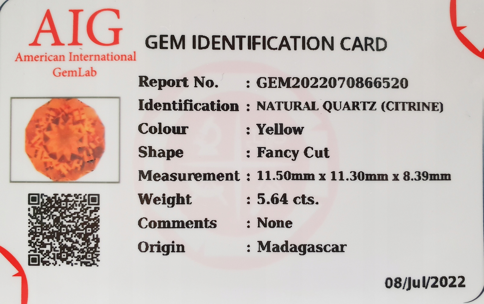 Натуральный цитрин 5,64 карата + сертификат