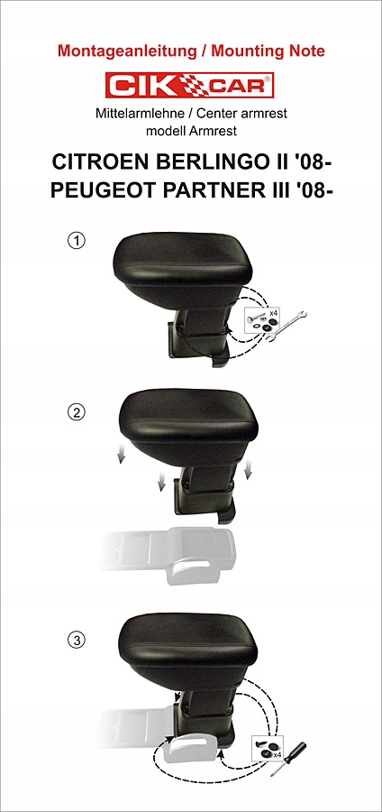 Подлокотник с монтажным адаптером (2-элементный поворот перед сборкой подлокотника), посвященный только автомобилю Citroen Berlingo II // Peugeot Partner II от 2008> + монтажный комплект (винты, заглушки)