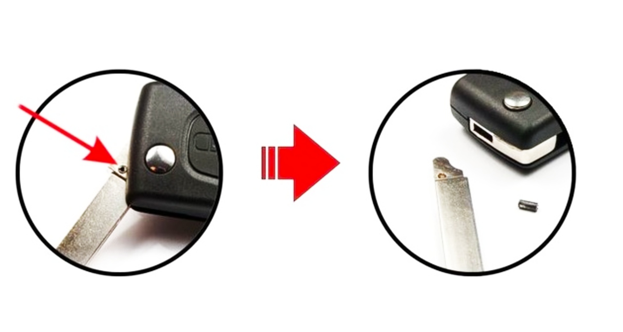 Для замены металлического лезвия в ключах типа «карманный нож» выбейте удерживающий его штифт тонким металлическим стержнем в обоих ключах (старом и новом).