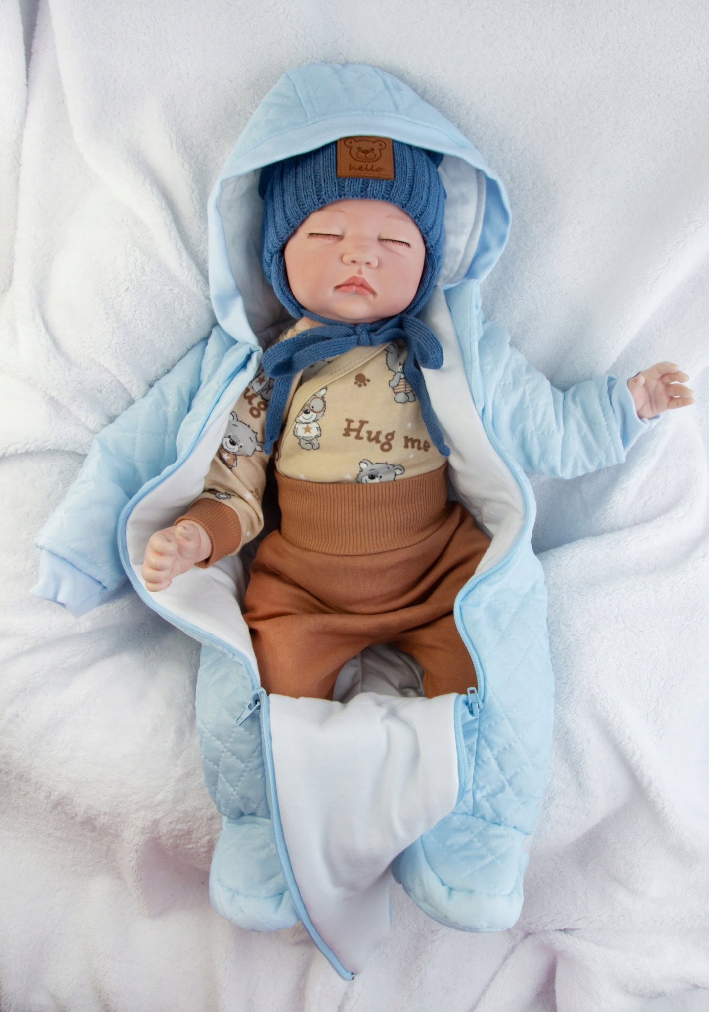 - костюм расстегивается на две глубокие молнии, поэтому вы можете положить его ровно, расстегнуть молнию, а затем спокойно усадить ребенка и застегнуть одежду.