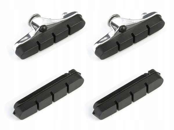 тормозные колодки для дорожных велосипедов. Изготовлен из универсальной смеси черной резины. Они характеризуются оптимальной отношением долговечности с силой торможения. Водооттрадание сокращает срок службы блоков. Дополнительная облицовка в наборе