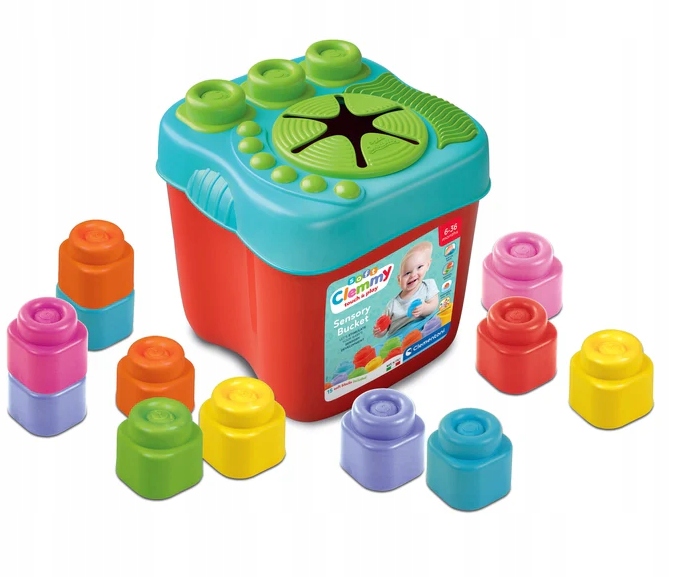 Новое ведро Clemmy с мягкой крышкой, оснащенное различными формами, конструкциями и соединениями, способствует игре с 15 кубиками, входящими в набор.