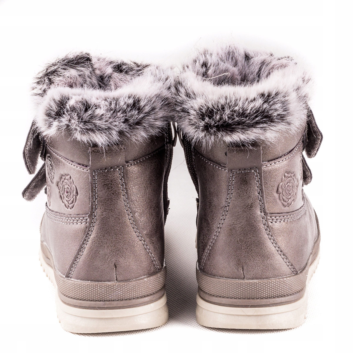 - Верхняя часть верха отделана пушистой бело-серой овчиной.