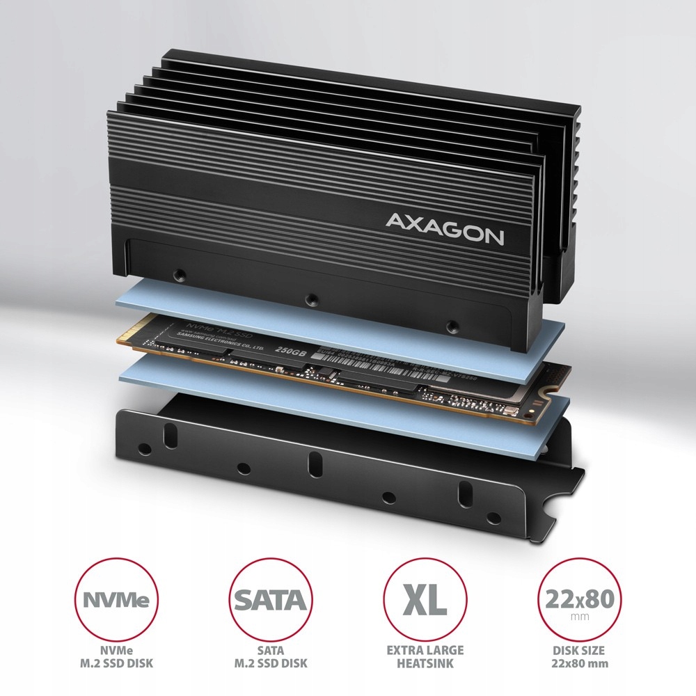 Пассивный охладитель AXAGON CLR-M2XL ALU для экстремального охлаждения высокопроизводительных твердотельных накопителей M.2, особенно NVMe. Универсальный пассивный радиатор можно использовать для карт M.2 размерами 22 x 80 мм. Входящие в комплект теплопроводящие прокладки позволяют устанавливать кулер на все односторонние и двусторонние SSD-накопители M.2.