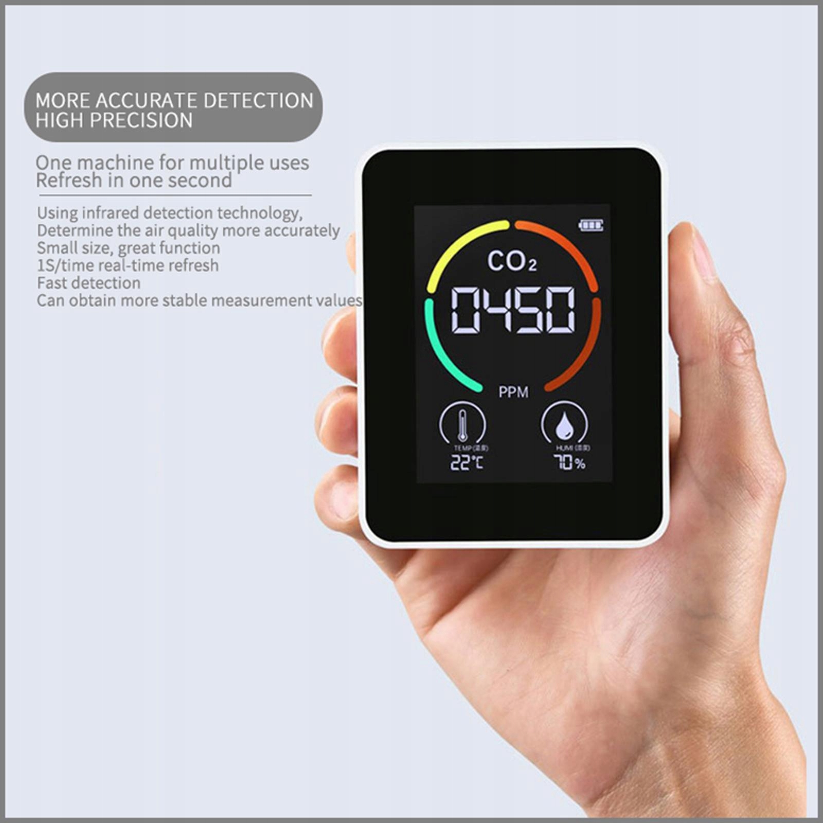 [Измеритель качества воздуха в комнате 5 в 1]: цифровой для легкого и прозрачного чтения; Дисплей CO2, дисплей, дисплей, температурный дисплей, дисплей влажности.