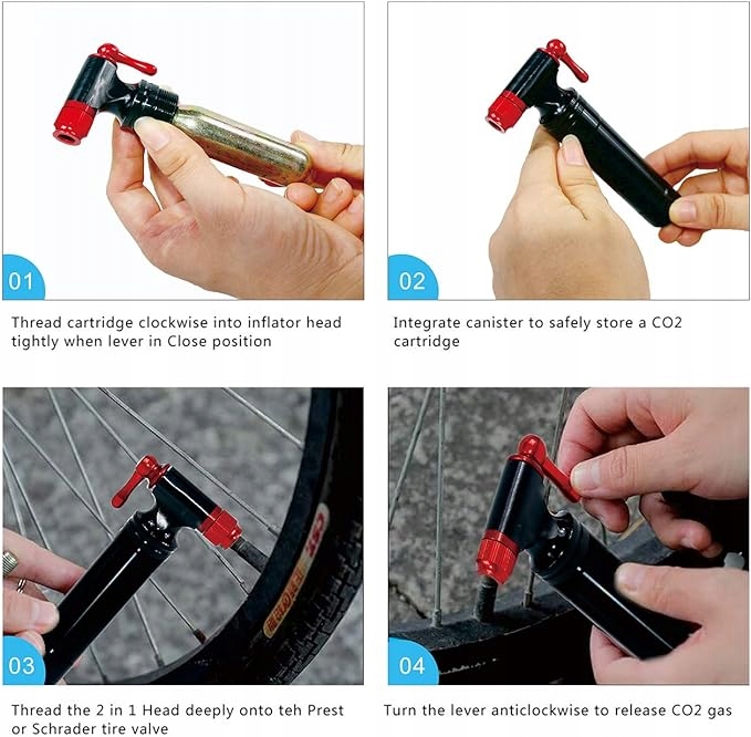 • ИНСТРУКЦИЯ ДЛЯ ВЕЛОСИПЕДНОГО НАСОСА CO2 (16 г): Плотно привинтите картридж CO2 к головке клапана (это относится к РЕЗЬБОВОЙ перфорации картриджа CO2) -> Накройте контейнером во избежание обморожения -> Подсоедините клапан -> Поверните рычаг для надувания. БЕЗРЕЗЬБОВЫЙ КАРТРИДЖ CO2 (16G): Вставьте картридж CO2 в контейнер -> Надежно закрутите контейнер и головку клапана -> Подсоедините клапан -> Поверните рычаг, чтобы надуть.