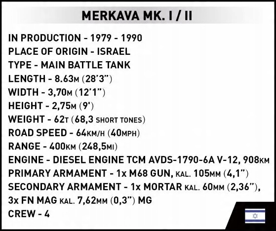 Модель танка Меркава Мк. I/II был точно воспроизведен из 825 строительных блоков COBI и реалистично отражает внешний вид своего музейного аналога. Подвижные элементы, такие как: башня и ствол танка, вращающиеся колеса и гусеницы, открывающиеся люкиallow Модель понравится всем любителям строительных блоков и военных предметов. Двигатель танка также воссоздан, и его можно увидеть, открыв сервисный люк. Благодаря интуитивно понятным инструкциям конструирование становится простым и увлекательным. Каждый взрослый любитель истории и военной техники наверняка будет рад пополнить свою коллекцию этой моделью. Благодаря моделированию в масштабе 1:35 танк соответствует другим машинам серии Armed Forces и идеально сочетается с Leopard 2A4, Leopard 2A5 и Abrams. В сотрудничестве с Немецким танковым музеем в Мюнстере. мы подготовили модель музейного экспоната танка Меркава Мк. Я/II. Меркава — первый основной боевой танк, разработанный и произведенный в Израиле. Серийное производство началось в 1979 году. С тех пор было создано четыре поколения. Танк используется исключительно Армией обороны Израиля и принимал участие во всех вооруженных конфликтах и военных операциях, проходивших после Войны Судного дня с участием Государства Израиль. Танк был спроектирован в соответствии с весьма специфическими требованиями ЦАХАЛа. Прежде всего, он обеспечивает очень хорошую защиту, что крайне ценно для израильских танкистов. Двигатель расположен спереди, легко доступен и дополнительно защищает экипаж. Башня и боевое отделение расположены в кормовой части танка. Башня клиновидная, корпус низкопрофильный, что облегчает рикошет пуль. Высокую огневую мощь обеспечивает усовершенствованная 105-мм пушка М68. Пустой боекомплект позволяет перевозить десант. Танк Меркава II оснащался, среди прочего: с усиленной броней, бортовыми экранами и улучшенной системой управления огнем. На смену танкам «Меркава II» наконец-то придут 3-е и 4-е поколения, вероятно, в 2021 году.
