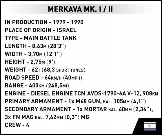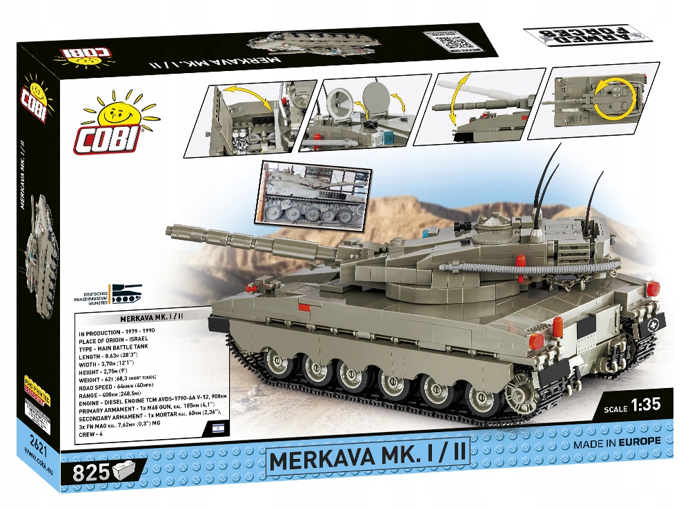 Модель танка Меркава Мк. I/II был точно воспроизведен из 825 строительных блоков COBI и реалистично отражает внешний вид своего музейного аналога. Подвижные элементы, такие как: башня и ствол танка, вращающиеся колеса и гусеницы, открывающиеся люкиallow Модель понравится всем любителям строительных блоков и военных предметов. Двигатель танка также воссоздан, и его можно увидеть, открыв сервисный люк. Благодаря интуитивно понятным инструкциям конструирование становится простым и увлекательным. Каждый взрослый любитель истории и военной техники наверняка будет рад пополнить свою коллекцию этой моделью. Благодаря моделированию в масштабе 1:35 танк соответствует другим машинам серии Armed Forces и идеально сочетается с Leopard 2A4, Leopard 2A5 и Abrams. В сотрудничестве с Немецким танковым музеем в Мюнстере. мы подготовили модель музейного экспоната танка Меркава Мк. Я/II. Меркава — первый основной боевой танк, разработанный и произведенный в Израиле. Серийное производство началось в 1979 году. С тех пор было создано четыре поколения. Танк используется исключительно Армией обороны Израиля и принимал участие во всех вооруженных конфликтах и военных операциях, проходивших после Войны Судного дня с участием Государства Израиль. Танк был спроектирован в соответствии с весьма специфическими требованиями ЦАХАЛа. Прежде всего, он обеспечивает очень хорошую защиту, что крайне ценно для израильских танкистов. Двигатель расположен спереди, легко доступен и дополнительно защищает экипаж. Башня и боевое отделение расположены в кормовой части танка. Башня клиновидная, корпус низкопрофильный, что облегчает рикошет пуль. Высокую огневую мощь обеспечивает усовершенствованная 105-мм пушка М68. Пустой боекомплект позволяет перевозить десант. Танк Меркава II оснащался, среди прочего: с усиленной броней, бортовыми экранами и улучшенной системой управления огнем. На смену танкам «Меркава II» наконец-то придут 3-е и 4-е поколения, вероятно, в 2021 году.