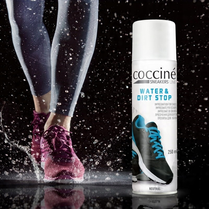 Независимо от времени года, даже в прекрасный солнечный день погода может удивить неожиданным ливнем. Используя проверенные решения и наш многолетний опыт, мы подготовили аэрозольную пропитку Cocciné WATER&DIRT STOP. Это эффективный и действенный препарат, который защитит обувь от внешних атмосферных факторов, таких как дождь, лужи с уличными загрязнениями или грязь.