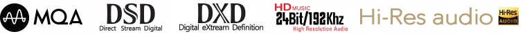 - Поддержка различных форматов файлов, таких как MQA, DSD (64/128), DXD (24 бит/352,8 кГц), MP3, FLAC, FLAC HD (до 24 бит/192 кГц), WAV, WAV HD (до 24 бит/192 кГц), WMA, M4A, AAC, HD AAC, APE/CUE, ALAC, Ogg Vorbis, PCM и другие, а также PLS и M3U плейлисты