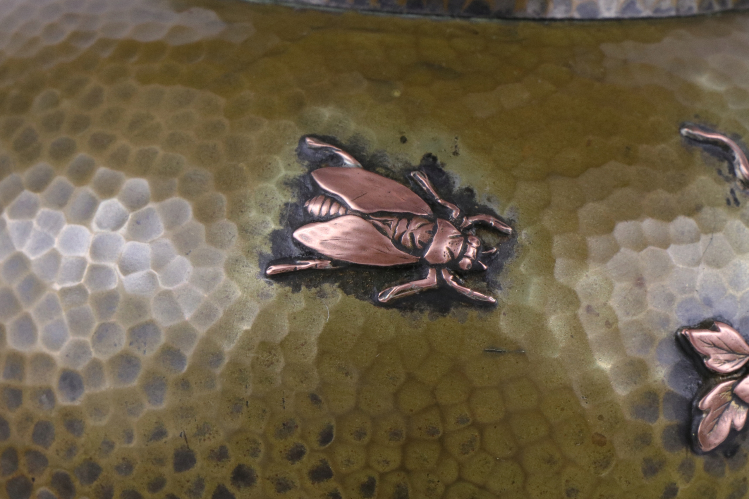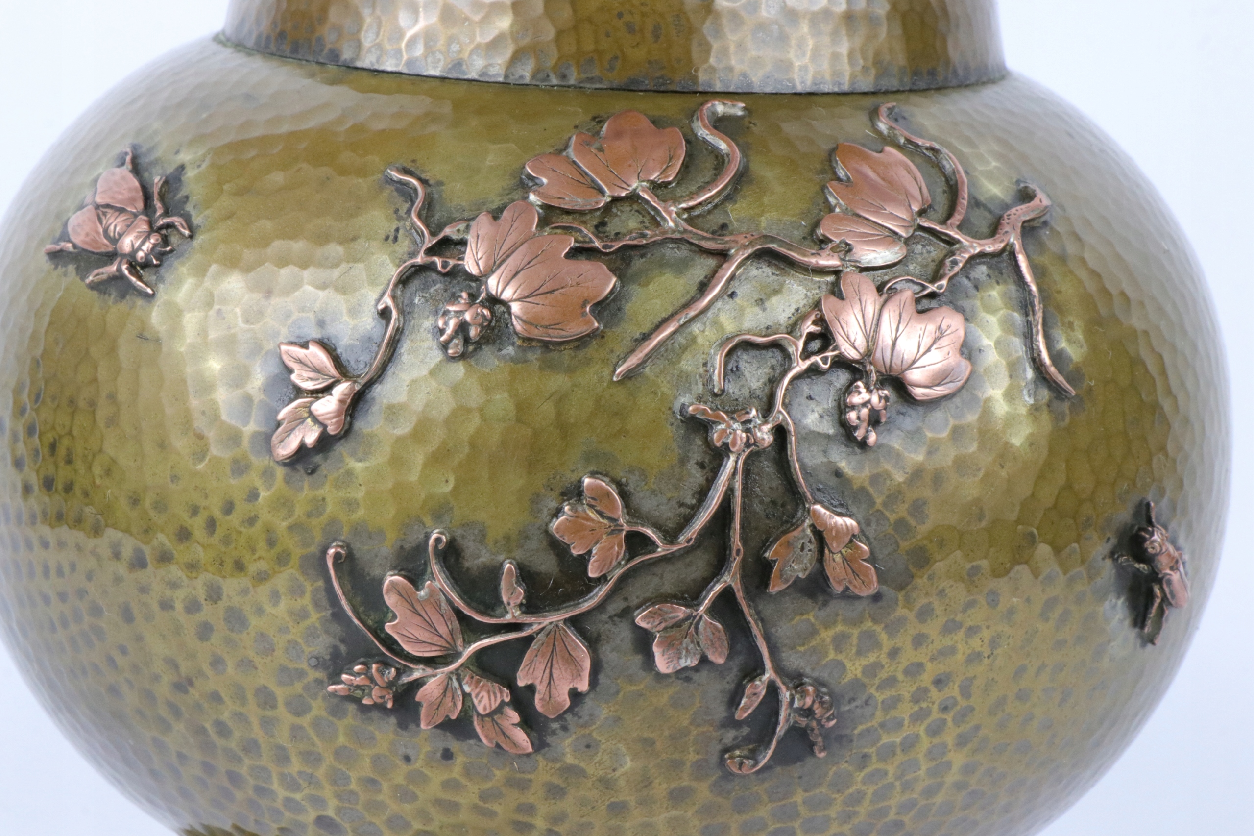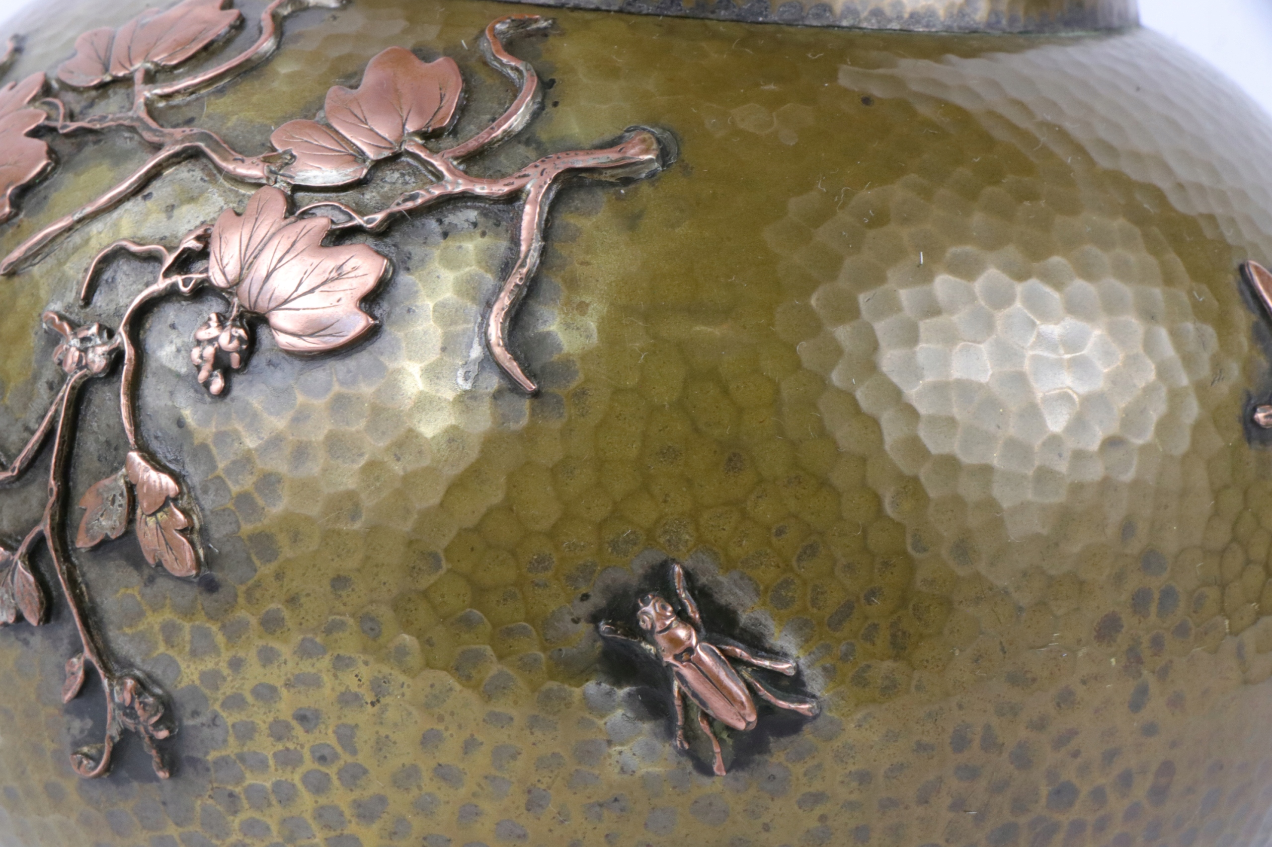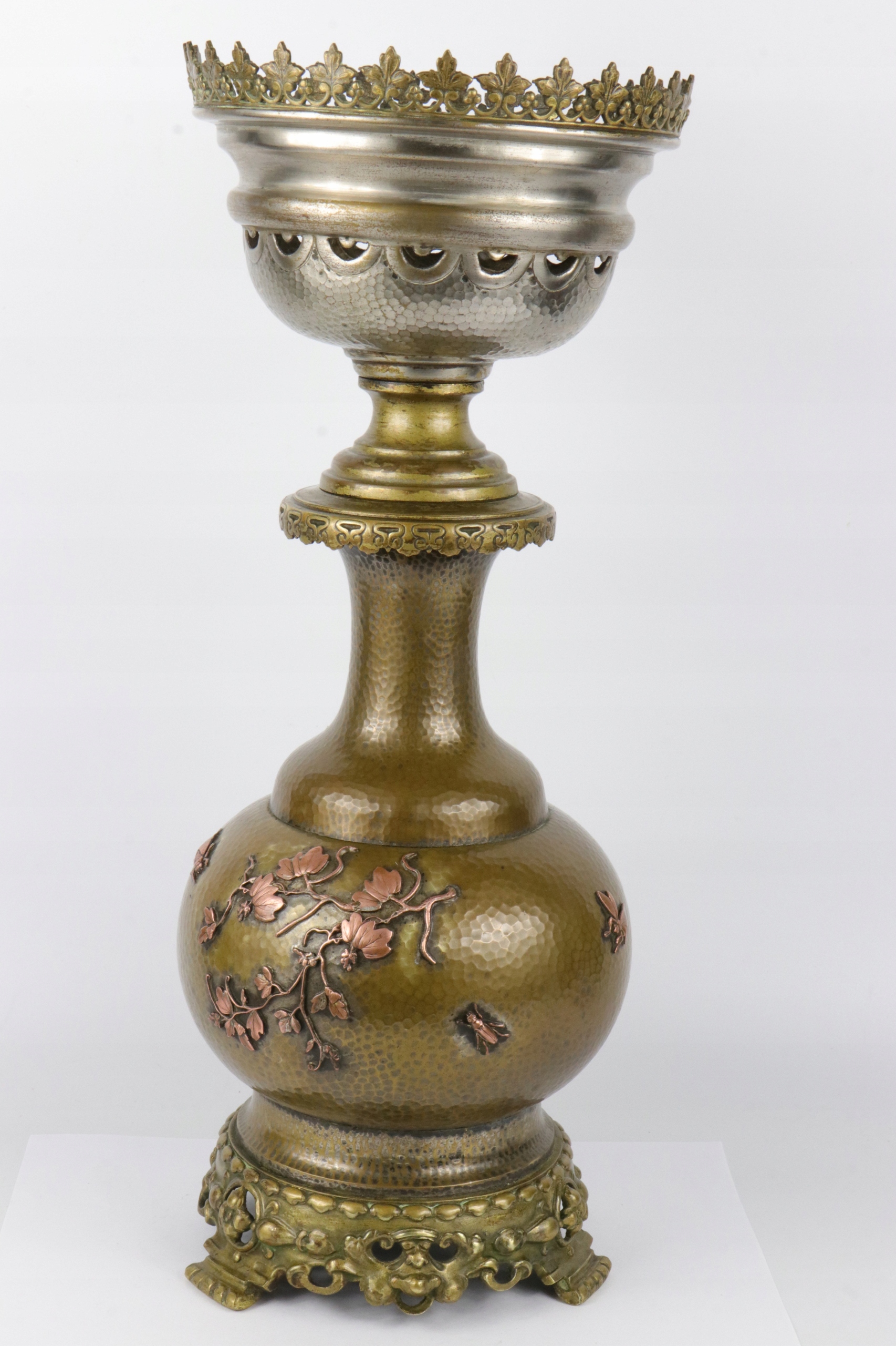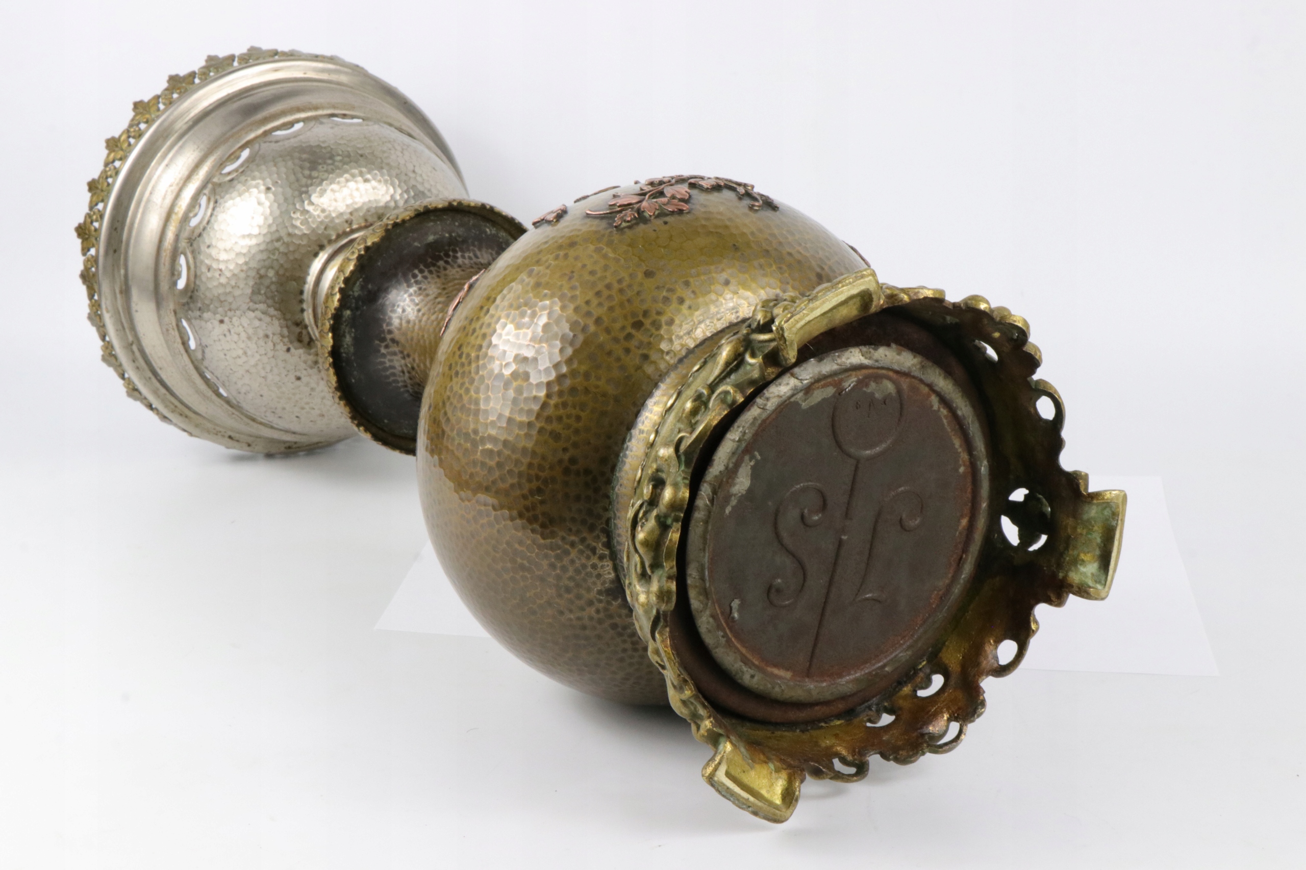 Основа масляной лампы из посеребренной латуни. Латунь, инкрустированная медным орнаментом в китайском стиле. Маслобак отмечен внизу. Возможно, цоколь лампы был модифицирован. Возможность отвинчивания верхней корзины для бачка лампы.