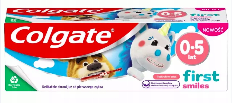 Colgate First Smiles 0-5 лет-это зубная паста для детей, специально разработанных для детей в возрасте до 6 лет. Он содержит фторид при 1000 ч / млн, рекомендованный стоматологами для этого возраста. Паста обеспечивает защиту эмали от кариеса. Он не содержит искусственных ароматов, подсластителей, красителей и SLS. С натуральным фруктовым ароматом.