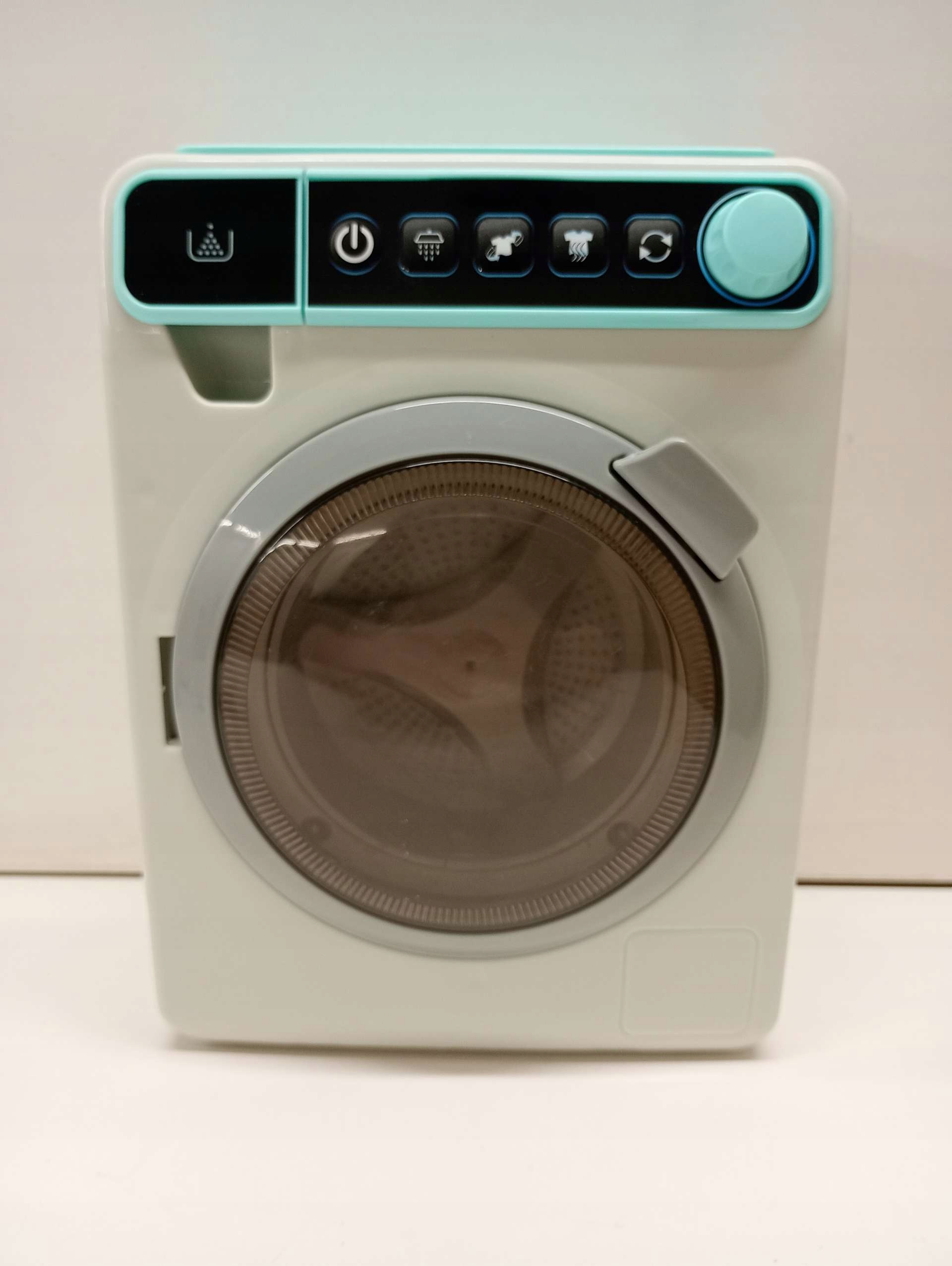 Проект: элегантная серая и синяя стиральная машина со светом и звуком, крылами, вращающимися барабанами и ящиком для введения мыла