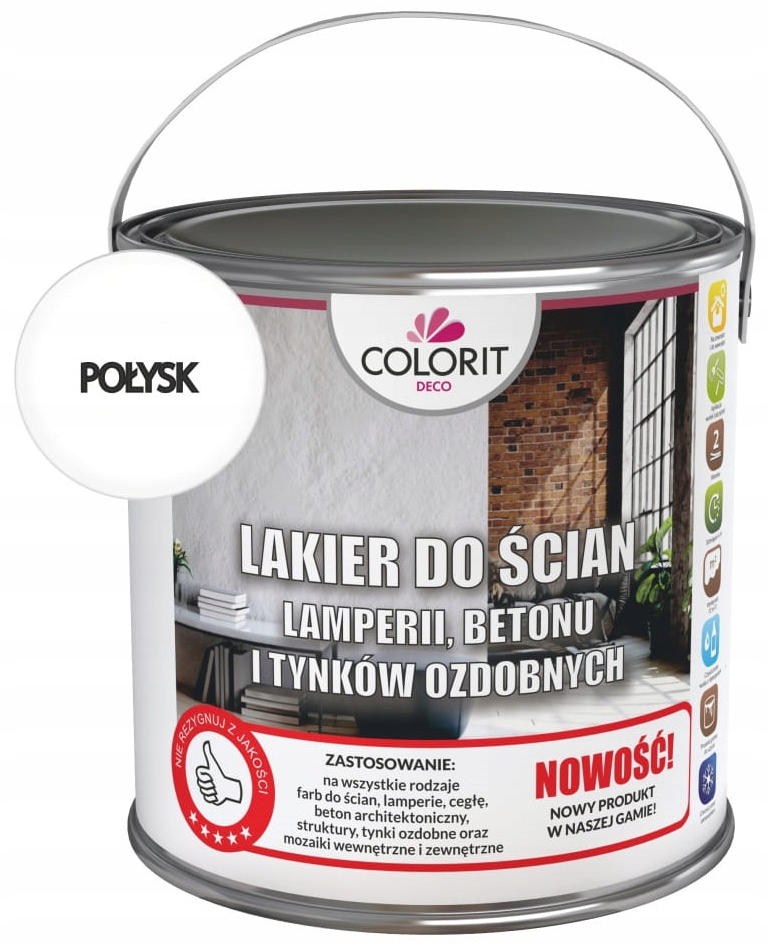 Лак для стен Colorit — универсальный продукт, который можно использовать как внутри, так и снаружи помещений. Предназначен для окраски стен (лакокрасочных покрытий), панелей, бетона, кирпича, декоративной штукатурки и декоративного камня. Позволяет защитить все эти поверхности и места, особенно подверженные загрязнению (например, ванная комната, прачечная). , кухня, детская, подсобные помещения, коридор и т.д.). Продукт характеризуется стойкостью к истиранию, создает легко моющееся и легко очищаемое покрытие.